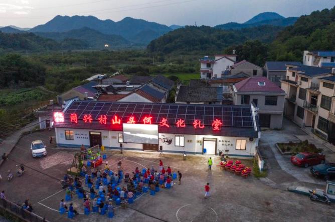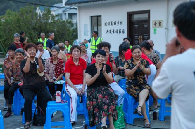 8月8日,在諸暨市同山鎮同興村的文化禮堂外,村民在觀看排舞表演。新華社記者 徐昱 攝