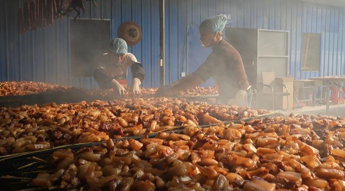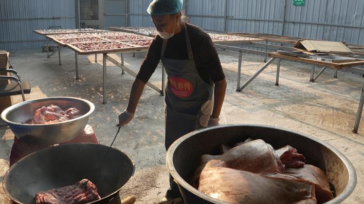 “從我記事開始,那時候只有過年才有菜(肉)來烘鲊肉菜。小時候好希望家里來客人,來客人的時候,父母親才把鲊肉挖出來待客,我們才能吃到鲊肉。”道縣四馬橋鎮華山村村民蔣文秀說,從小就開始跟隨父母制作鲊肉,成家后又與丈夫一起經營著一家小飯店。飯店的鲊肉都是她親手制作的,幾乎每桌客人前來,都會點一份。后來因需要照顧老幼,他們關閉了飯店,但是仍有很多顧客打電話求購鲊肉。于是她開始在家里專門制作鲊肉來進行售賣,每年冬季都會銷售上萬斤鲊肉出去。