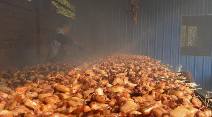 鲊肉制作的第一道工序叫“踏皮”,將洗凈的整塊五花肉皮朝下在燒熱的大鍋里用高溫“踏”一遍,這樣不僅能去除豬皮上殘留的豬毛,還能去除豬皮上的異味,口感也會更加香脆。“踏皮”之后再將五花肉切成大小均勻的塊狀,不能切大塊,切大塊了不入味,也不能切小了,切小了熏烤后就只有一點點。切好的五花肉里再加入食鹽以及自家釀的高度紅薯酒攪拌均勻腌制一晚,讓其入味。腌制過后的五花肉在第二天便可進行煙熏,但在蔣文秀這里煙熏也與別家不同。“熏的時候也要講點技巧的,首先把腌制好的肉晾曬3天左右,盡量把水分晾干,然后再上灶熏。在熏的時候加我們本地的雜木碳、茶籽殼、甘蔗皮、橙子皮,這樣熏出來的鲊肉就有茶果的香味。”
