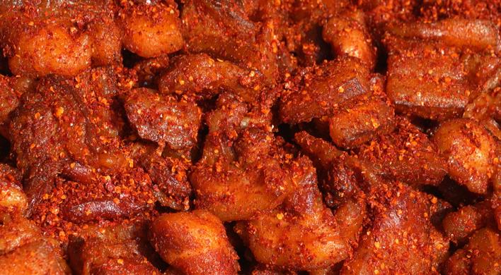 鲊肉經過6小時左右的熏烤,色澤金黃、香味濃厚。入辣味也是制作鲊肉的關鍵工序,把熏好還帶著熱氣的肉放入大鍋中,加入本地山茶油和本地辣椒粉,再攪拌均勻,一道辣椒與臘肉完美結合的道州鲊肉就算制作完成了。正宗的道州鲊肉會帶有一股壇香味,這就需要將制作好的鲊肉放入壇中密封發酵保存,隨食隨取。