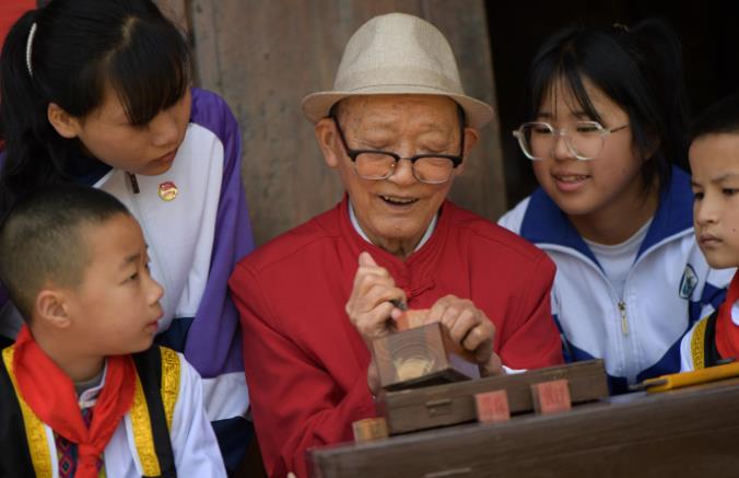 今年95歲的胡顯清是貴州省黔東南苗族侗族自治州天柱縣高釀鎮地良村人,曾從事美術、陶瓷彩繪等工作。1987年退休后,胡顯清向家鄉的學生傳授書法、篆刻、繪畫技藝,并于2019年在地良村成立了“古藤書畫屋”,義務傳承和發展傳統文化。