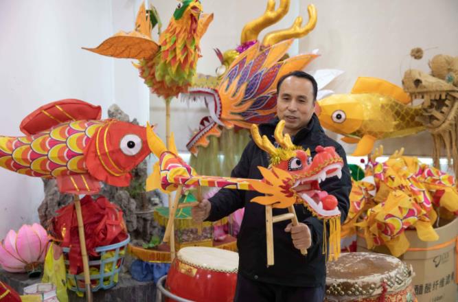 1月30日,南昌市青云譜區城南龍燈工廠,城南龍燈傳承人史克濱展示為兒童設計生產的小板凳龍。