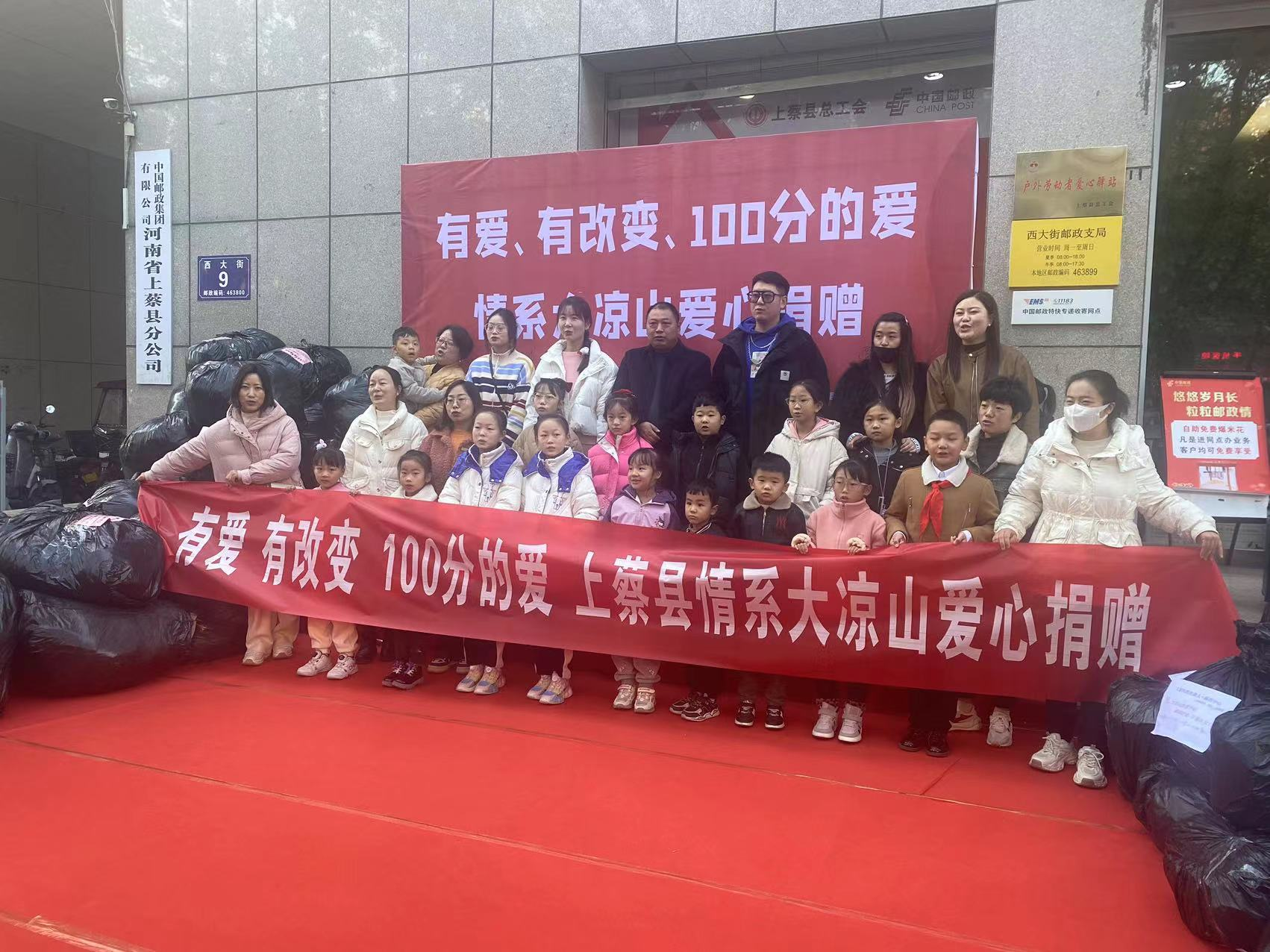 11月19日上午,中國郵政集團有限公司河南省上蔡縣分公司與多家愛心培訓機構,共同發起了以“有愛 有改變 100分的愛 情系大涼山愛心捐贈”為主題的衣物捐贈活動,不僅為大涼山區的孩子們送去急需的衣服、鞋子等愛心物品,也送去了社會的關愛和溫暖。