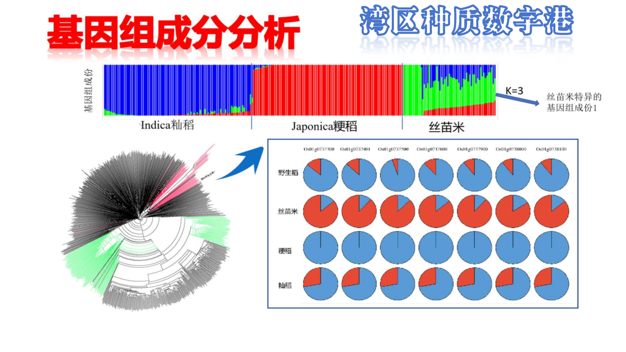 廣東省農(nóng)業(yè)農(nóng)村廳 “灣區(qū)種質(zhì)數(shù)字港”三年來(lái)已匯聚起856份絲苗米核心種質(zhì)和20000余份關(guān)聯(lián)種質(zhì),基因組、表型組等組學(xué)數(shù)據(jù)已超1000億,通過(guò)對(duì) “表型+基因型”身份鑒定建立起了“五位一體”的身份識(shí)別系統(tǒng),能夠快速追溯、確定種質(zhì)資源的系譜關(guān)系。還對(duì)2000多萬(wàn)個(gè)多態(tài)性位點(diǎn)大數(shù)據(jù)聚類(lèi)分析,定位了增城絲苗米與秈米、粳米比對(duì)的特異性基因區(qū),發(fā)掘到與株高、粒長(zhǎng)等關(guān)聯(lián)的SNP位點(diǎn),證明水稻控制粒型的幾個(gè)關(guān)鍵功能基因(GS3,GW5和GL7)在廣東絲苗米粒型改良中起關(guān)鍵作用,初步找到了廣東絲苗米優(yōu)異品質(zhì)相關(guān)的功能基因。本次大會(huì)上具體負(fù)責(zé)灣區(qū)種質(zhì)數(shù)字港建設(shè)的廣州國(guó)家農(nóng)業(yè)科創(chuàng)中心首次發(fā)布了絲苗米種質(zhì)的這些宏觀規(guī)律大數(shù)據(jù),通過(guò)1000億條組學(xué)數(shù)據(jù)進(jìn)行遺傳距離分析,追溯增城絲苗米的全國(guó)“嫡系血親”,并數(shù)字模擬還原增城絲苗米500年的“開(kāi)枝散葉”路徑,從內(nèi)源遺傳規(guī)律上解釋了增城絲苗米500年來(lái)為什么一直作為“米中極品”而驚艷不休。