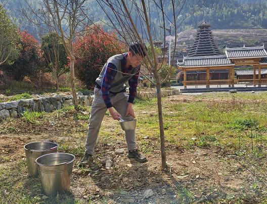 圖為大寨社區村民蒙澤軍給剛剛種下的桃樹苗澆水