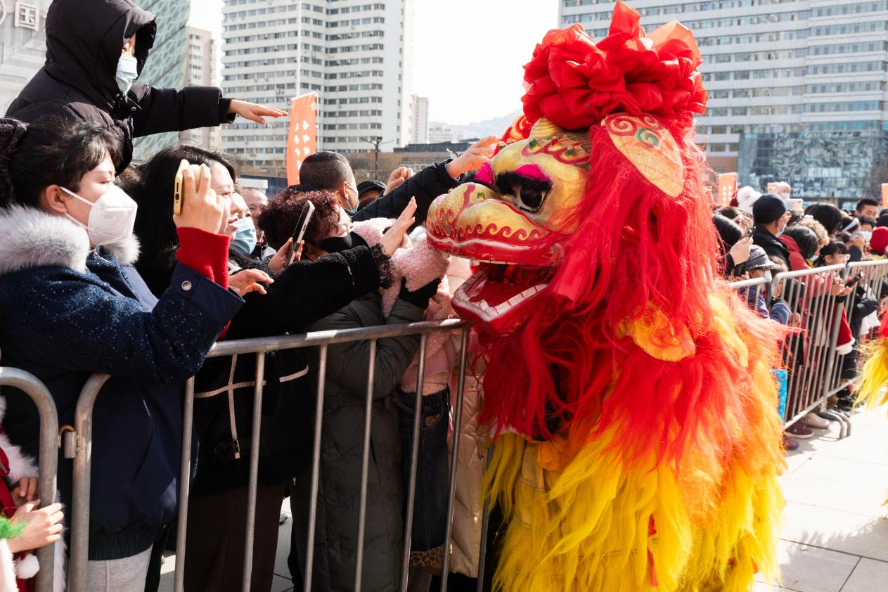 首先出場的是大鼓與舞獅表演。一面面大鼓被高高架起,鼓手們掄起粗壯的鼓槌,奮力敲擊,雄渾厚重的鼓聲震耳欲聾,仿佛在訴說著過去一年的豐收喜悅,又似在展望新一年的美好愿景。而靈動的舞獅在鼓聲中閃轉騰挪,它們時而跳躍、時而俯臥,栩栩如生的模樣,搭配上靈動的眼神和俏皮的動作,活靈活現,與激昂的鼓聲相得益彰,贏得臺下觀眾陣陣熱烈的喝彩與掌聲。