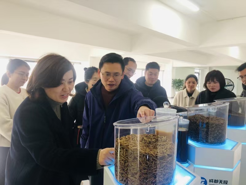 作為一家以“雙碳”目標為引領、深耕循環經濟領域的高新技術企業,天投蔚藍自成立以來,始終聚焦“無廢城市”建設,創新構建餐廚垃圾全生命周期管理模式,通過自主研發的“預處理提油+黑水虻生物轉化處理”核心工藝,實現垃圾資源化高效利用。調研組一行實地參觀了企業全封閉式廠房,詳細了解其集成的先進除臭、污水處理系統。天投蔚藍董事長蔡濤介紹,該技術不僅實現臭氣與污水達標排放,更有效破解垃圾處理“鄰避效應”,為城市環境治理提供了可復制的解決方案。