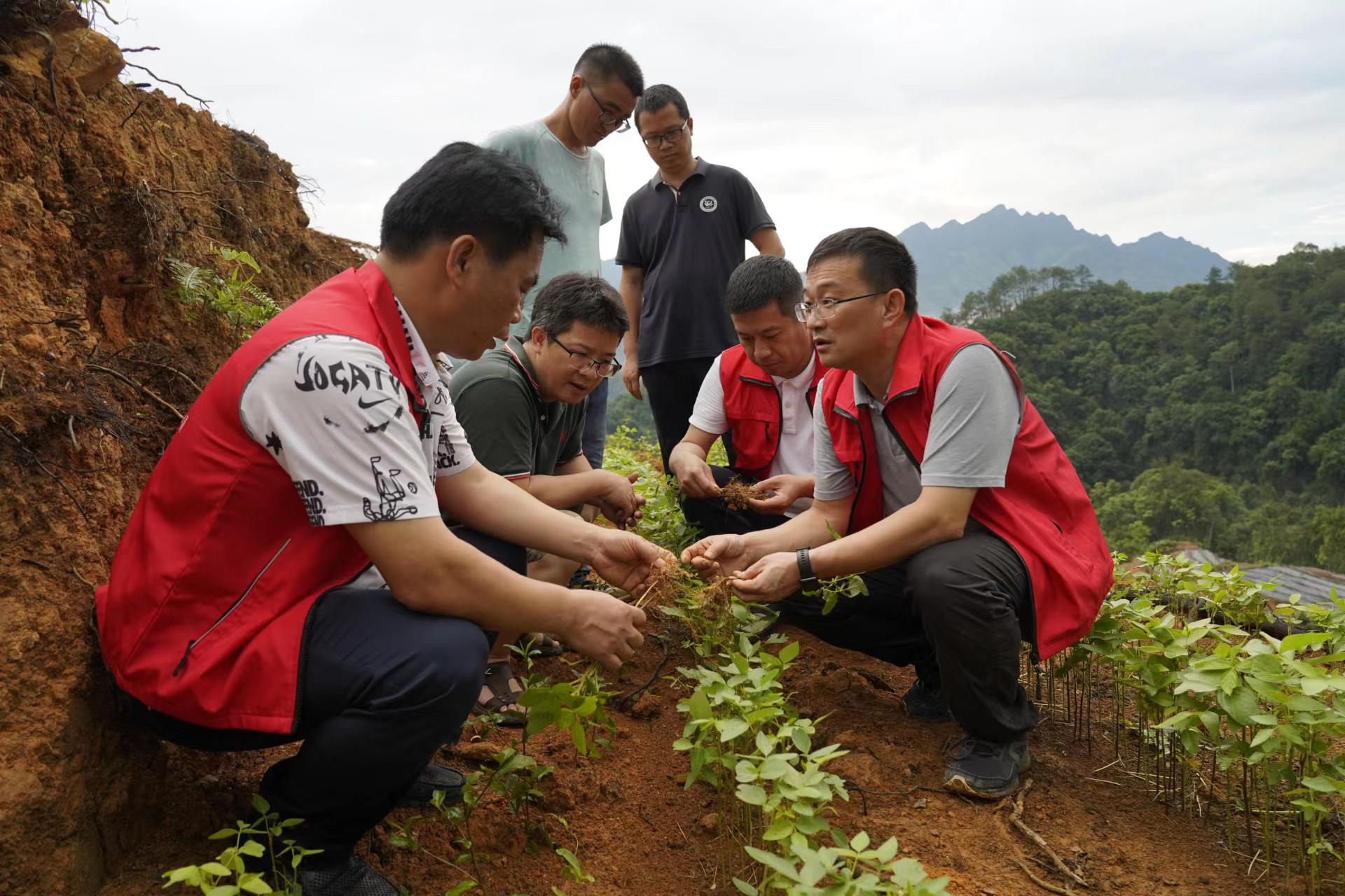 科技特派團(tuán)昭平團(tuán)陳淵團(tuán)長(zhǎng)帶領(lǐng)大豆產(chǎn)業(yè)組會(huì)同縣級(jí)相關(guān)茶業(yè)的科技特派員到黃姚小黑豆種植基地服務(wù)(廣西山區(qū)綜合技術(shù)開發(fā)中心供圖)