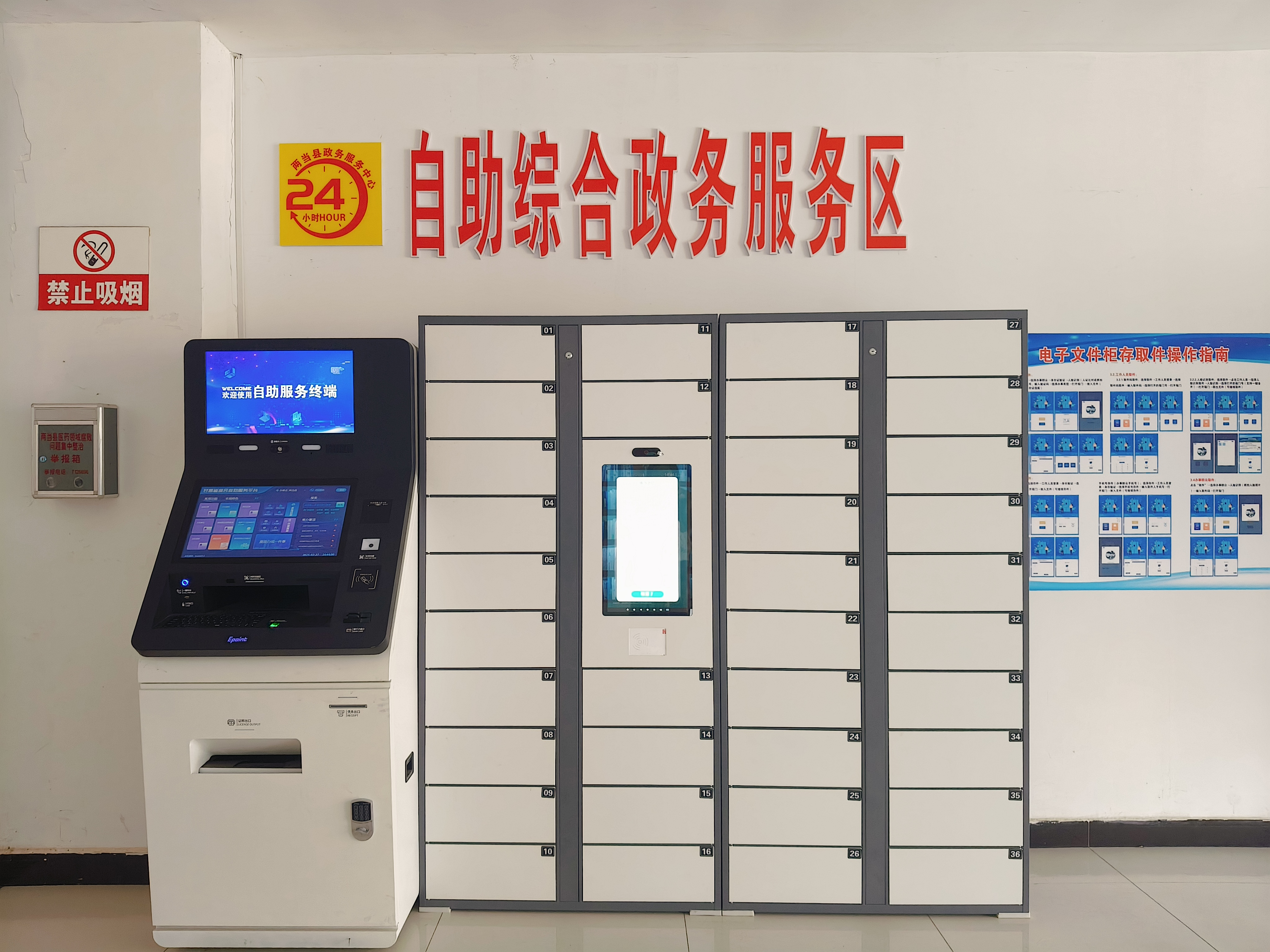 群眾通過自助服務終端,選擇所需辦理的事項,依托一體機自帶的高拍儀將相關材料上傳,利用自動生成專屬二維碼打開指定的文件交換柜,將相關資料裝入文件袋存入電子文件柜后便可離開。接下來,系統會短信通知工作人員前來收取資料,通過申報、回執打印、資料存入等簡易環節,便可實現政務事項24小時全天候受理。業務辦理完成后,群眾既可以選擇郵寄送達,也可以隨時到電子文件柜或辦事窗口直接領取。