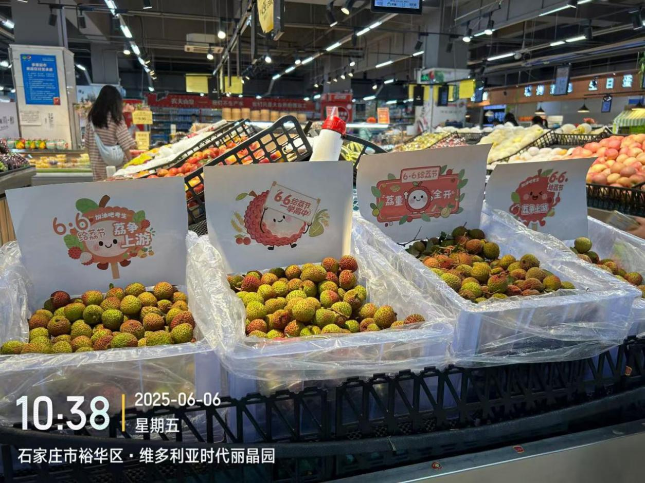 河北省石家莊市商超里的荔枝和“6·6給‘荔’節”宣傳物料