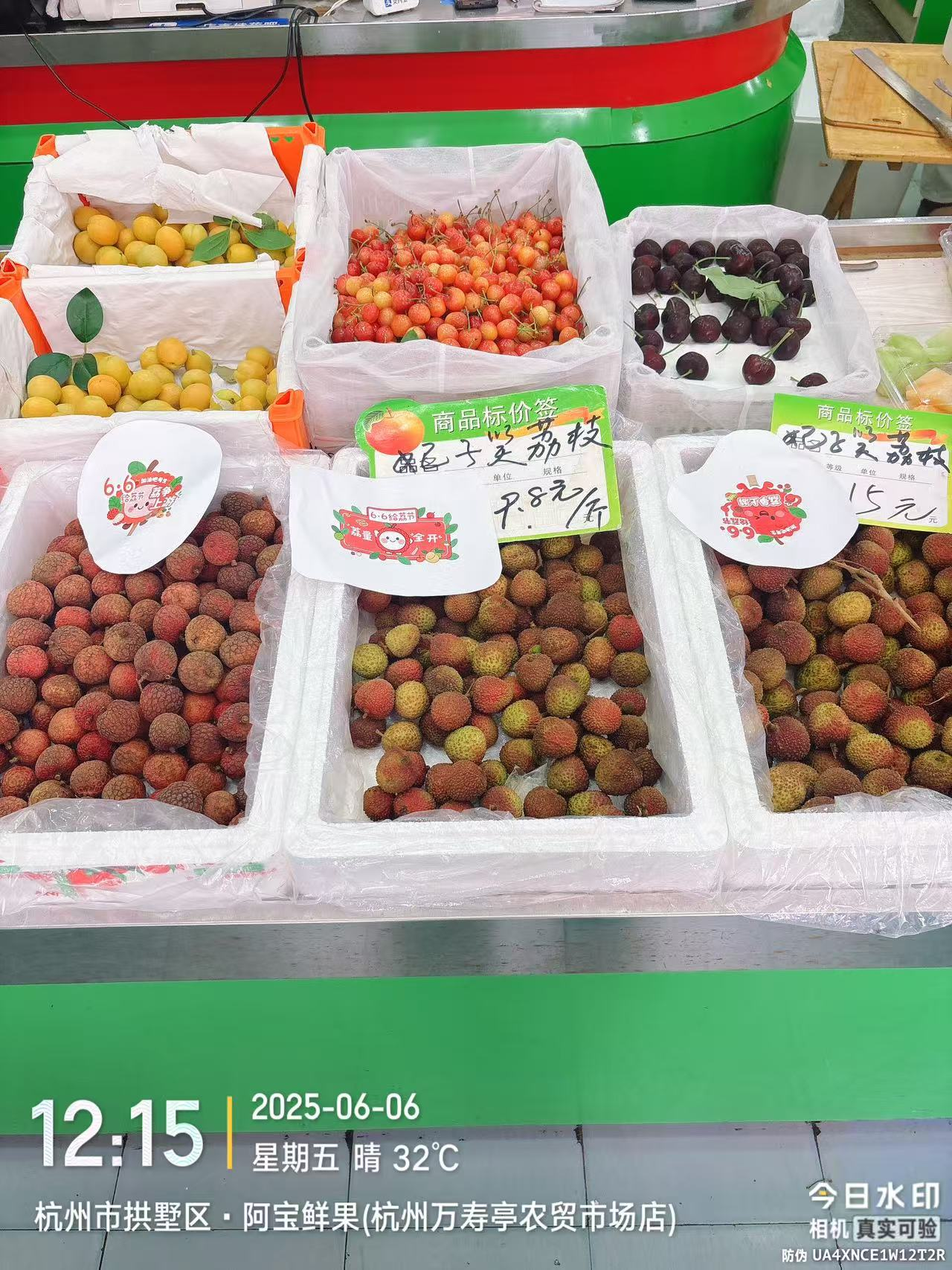 浙江省杭州市拱墅區·阿寶鮮果售賣的荔枝產品,擺放了“6·6給‘荔’節”宣傳物料