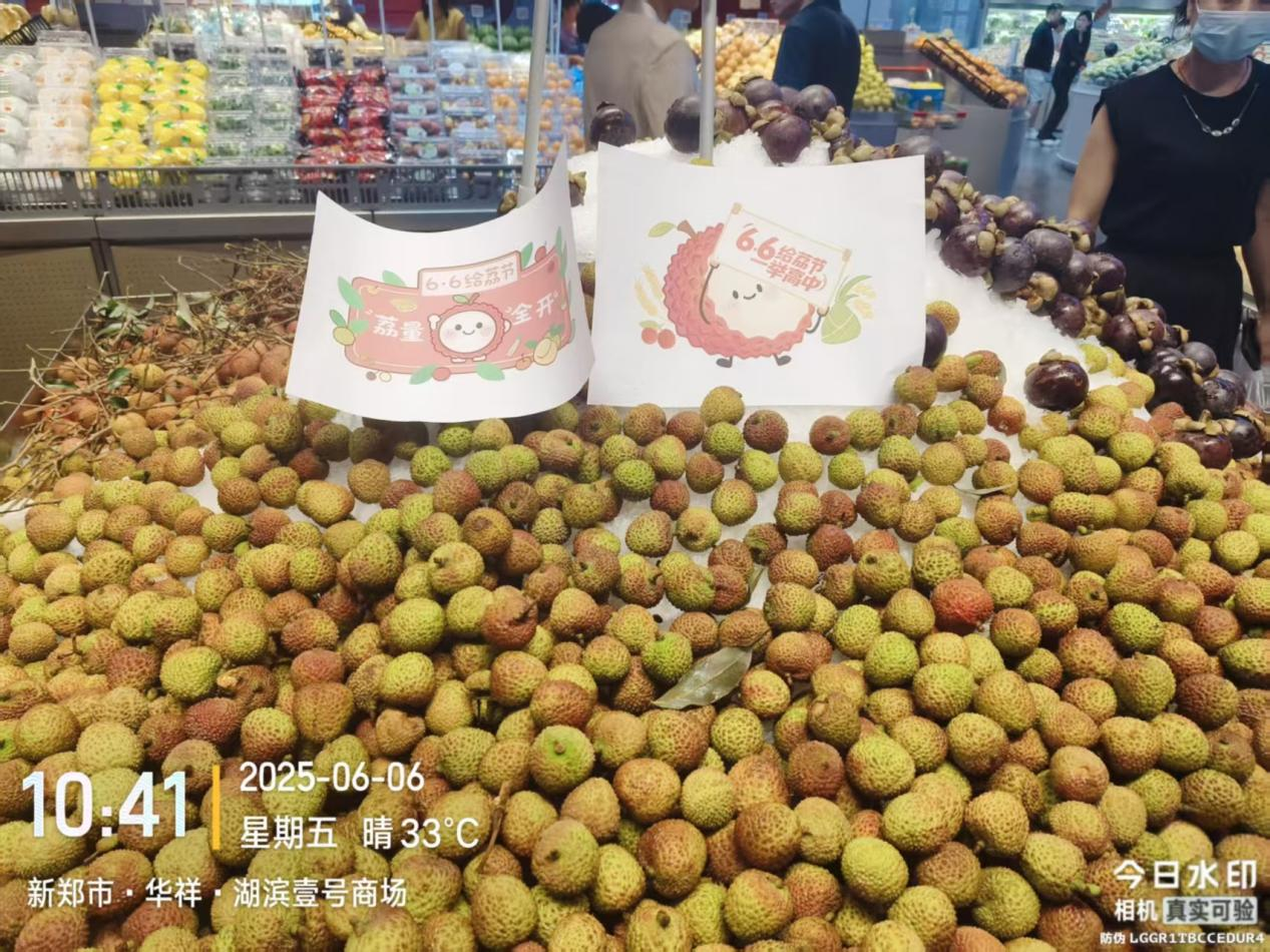 河南省鄭州市新鄭市商場售賣的荔枝,擺放的“6·6給‘荔’節”宣傳物料