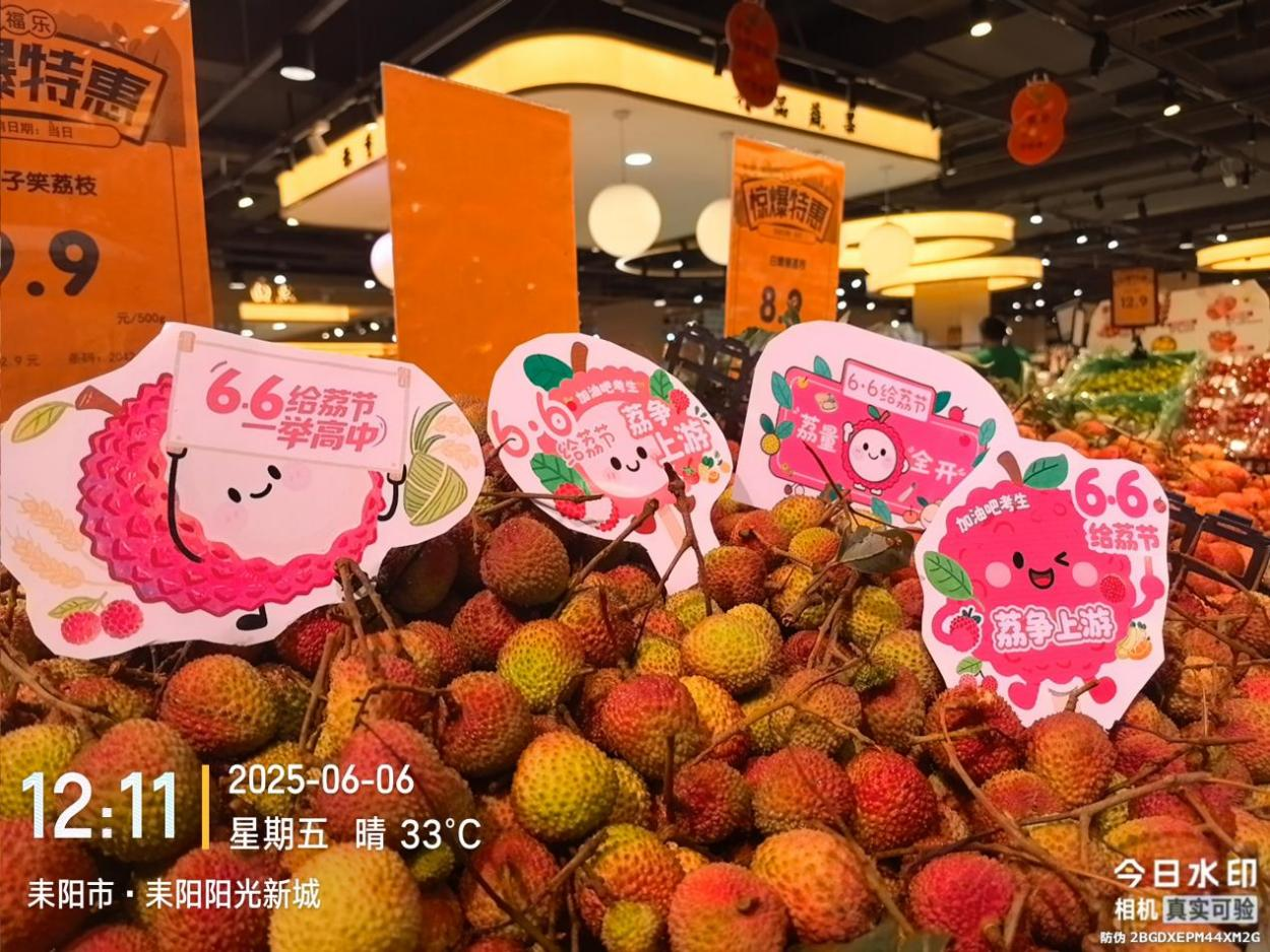 北京市豐臺區的商店貨架上擺放著荔枝,“6·6給‘荔’節”的宣傳物料顯眼。