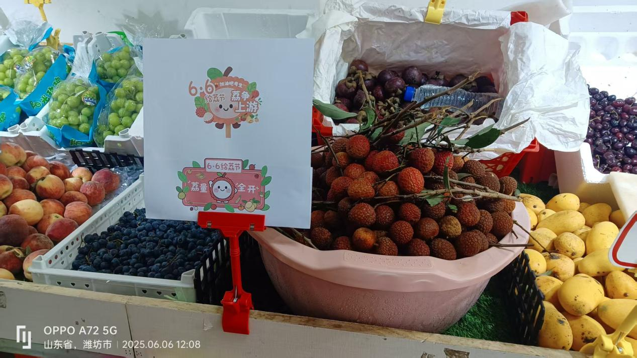 山東省濰坊市商店里售賣的荔枝和擺放的“6·6給‘荔’節”宣傳物料