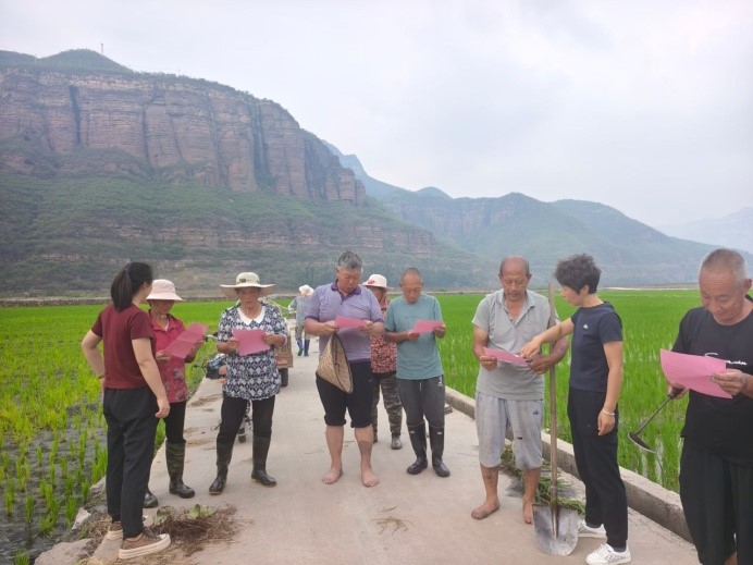 圖為涉縣農業農村局農技人員在田間開展技術指導并發放宣傳資料