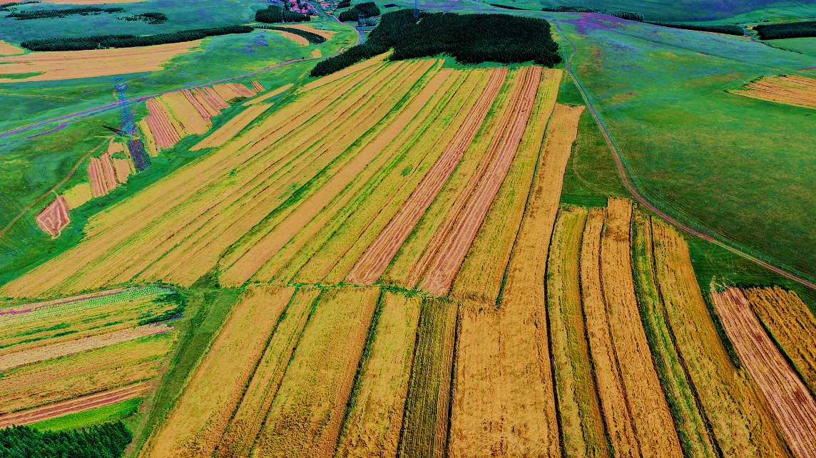 在克什克騰旗西北部,集中連片的莜麥田如“金色織錦”般鋪展。不同于平原農田的一馬平川,這里的農田多為舒緩坡地。金秋時節,成熟的莜麥從坡底“起筆”,順著地勢起起伏伏地向上延展,一路攀援至遠處高山的半山坡。從空中俯瞰,金色的莜麥帶宛如靈動的綢帶,在大地間蜿蜒舞動:有的與翠綠草地形成鮮明色彩對比,有的與挺拔林帶交織出自然韻律,還有的在風電塔的映襯下,勾勒出“生態田園”的現代美感。每一道起伏的壟溝、每一片延展的麥浪,都是大自然與農人的共同創作,將豐收的壯美書寫在天地之間,場面恢弘又充滿詩意。