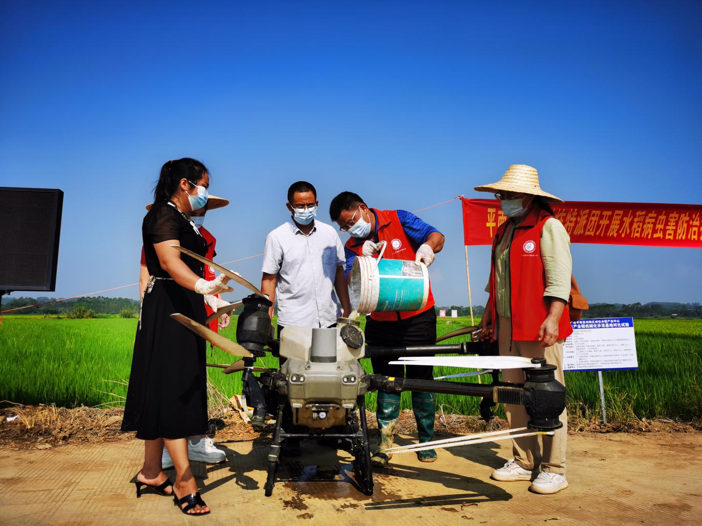 (平南縣鄉(xiāng)村科技特派員利用無(wú)人機(jī)開(kāi)展水稻病蟲(chóng)害防治活動(dòng)現(xiàn)場(chǎng) 通訊員林益群供圖)