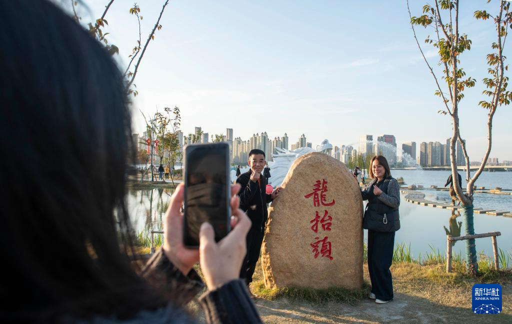 11月8日,游客在安徽省蚌埠市龍子湖風景區一處景點拍照留影。