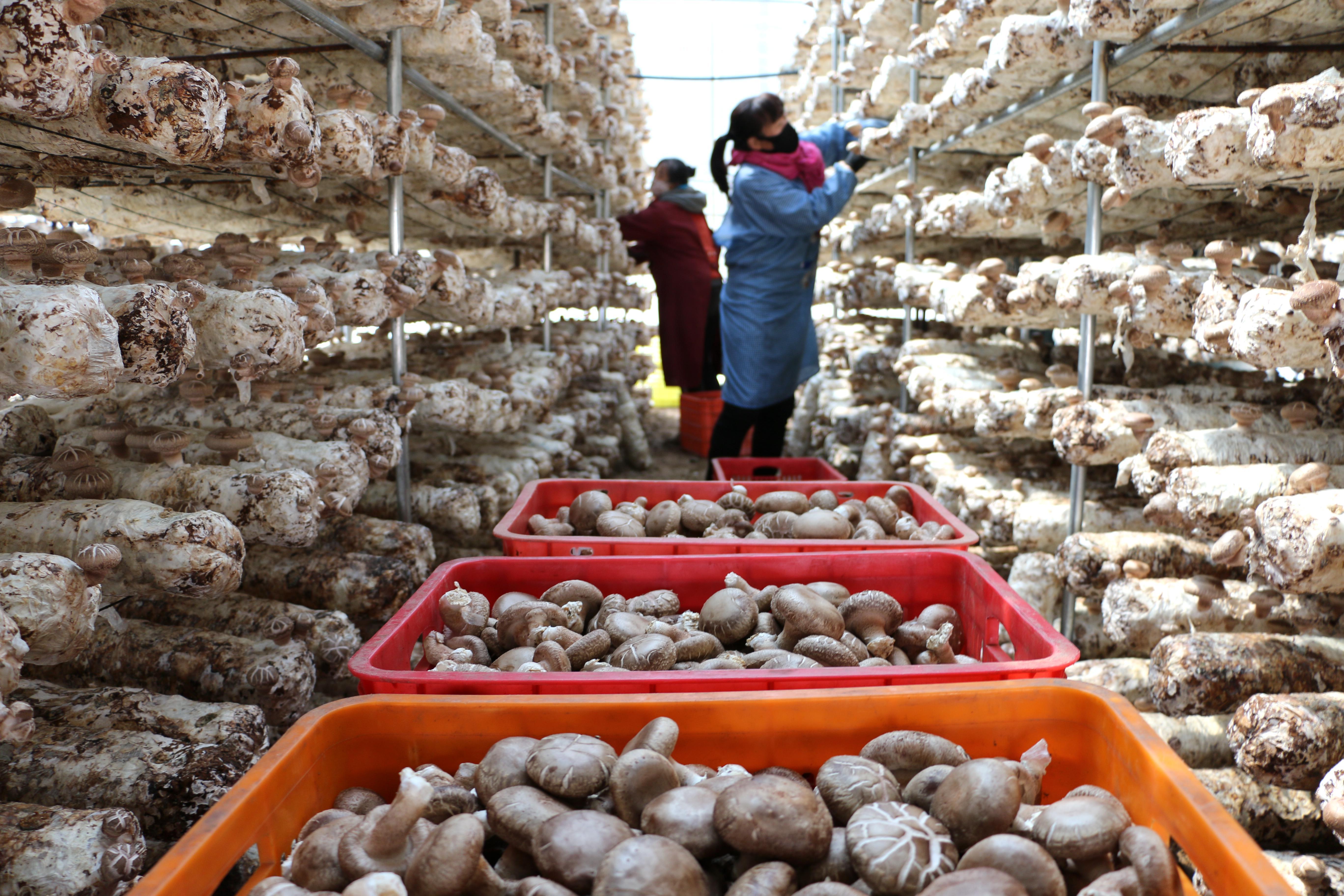 ?4月26日,農民在河北省平泉市平北鎮平東食用菌專業合作社園區大棚里采收香菇。