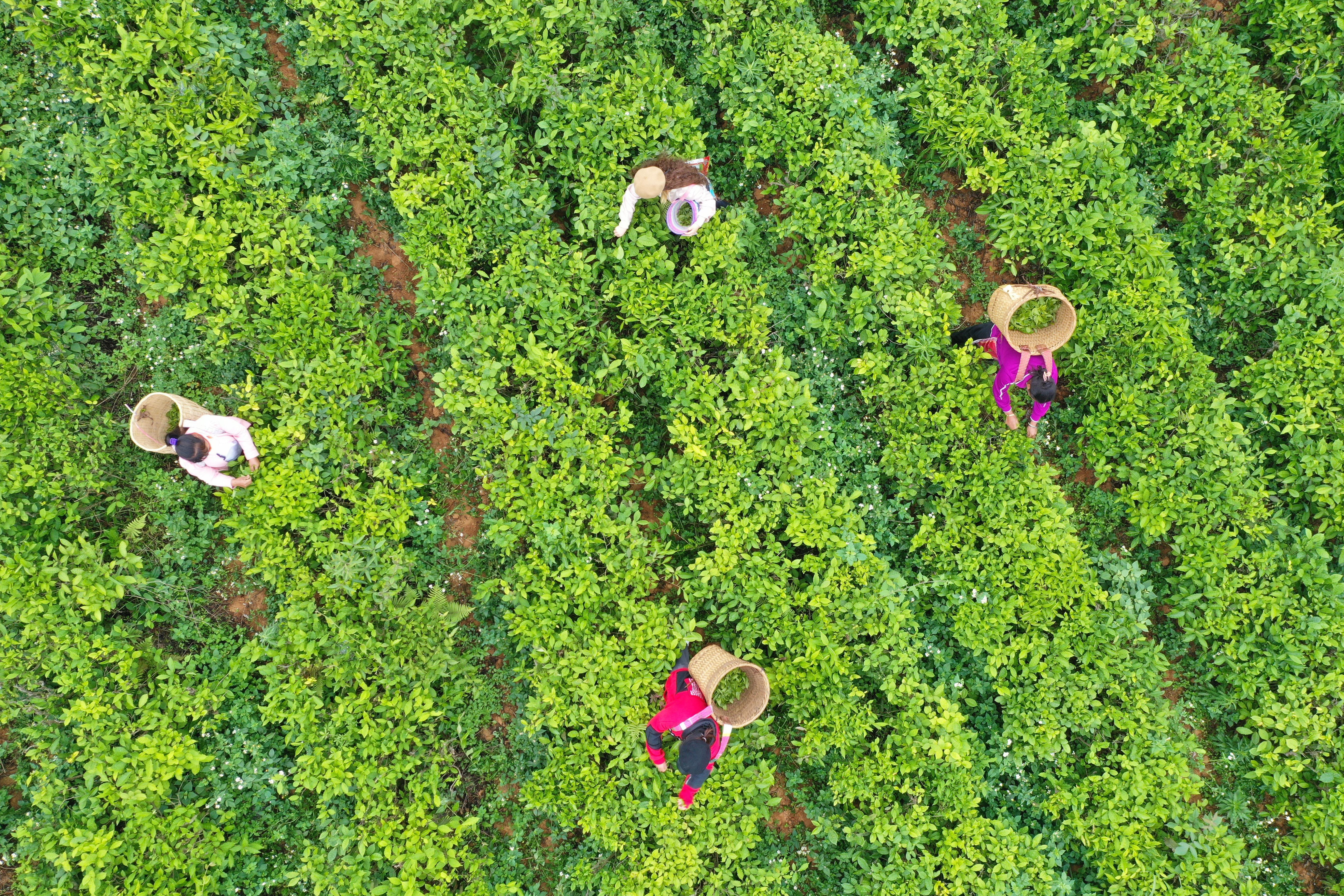 4月23日,在廣西隆林各族自治縣者浪鄉(xiāng)么窩村現(xiàn)代茶葉產(chǎn)業(yè)示范園,當(dāng)?shù)卮迕裨诓刹?無(wú)人機(jī)照片)。
