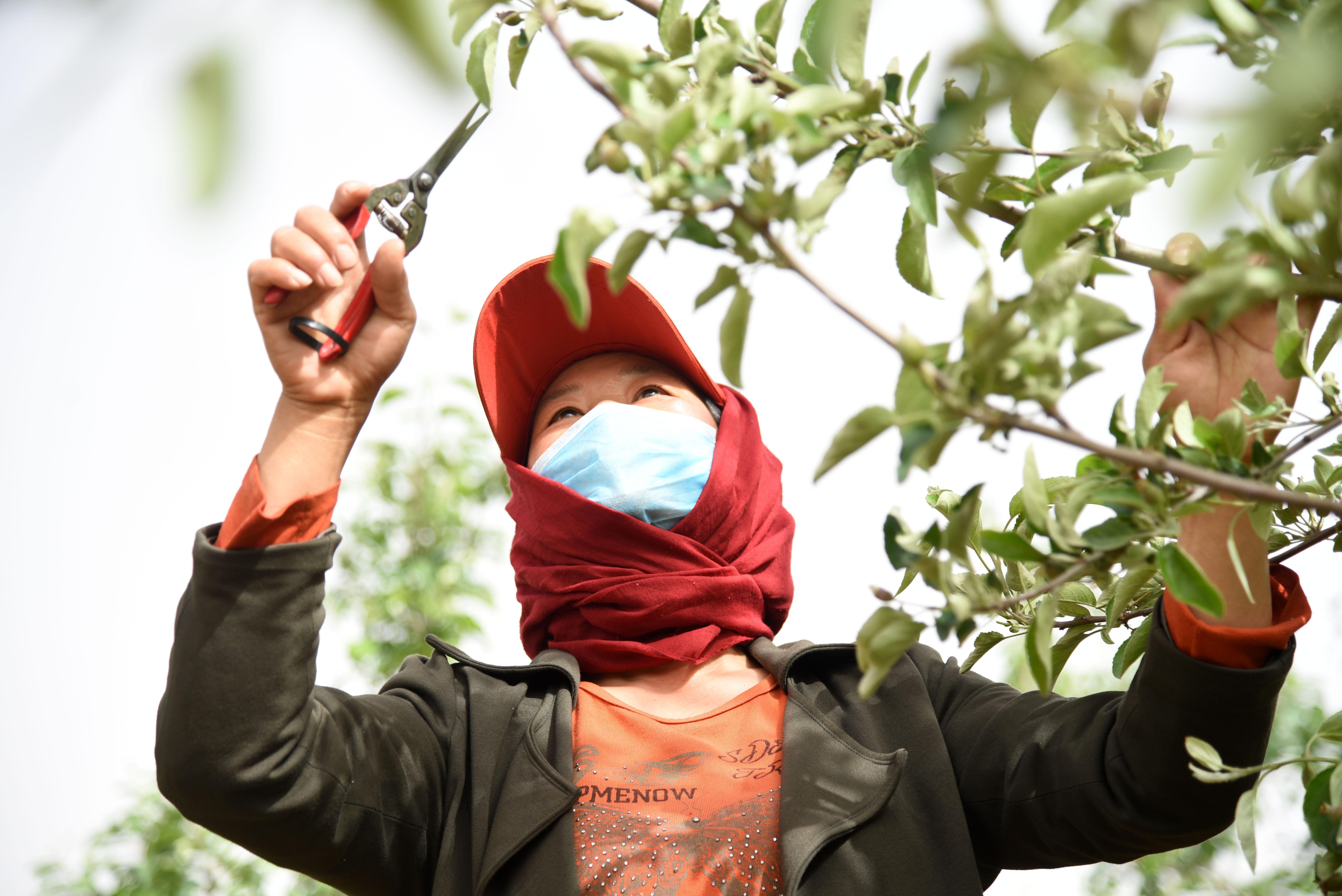 ? 5月12日,于淑愛在水庫邊的蘋果園里工作。