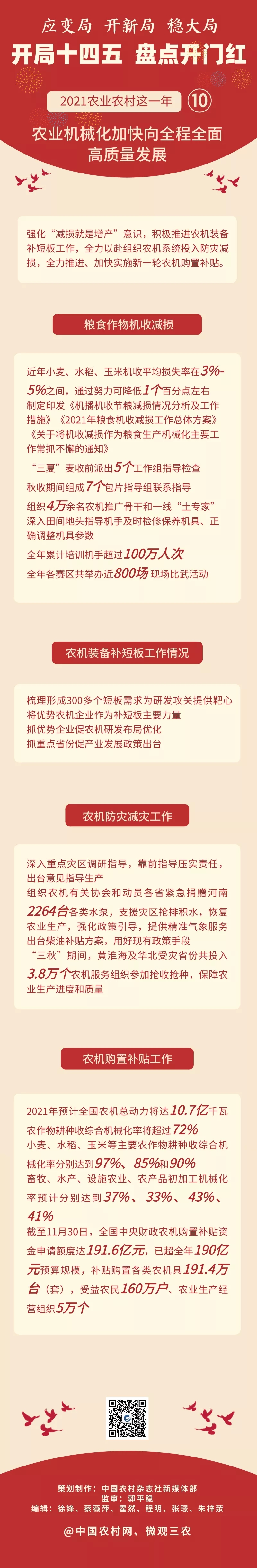 農(nóng)機購置補貼是黨中央、國務(wù)院重要的強農(nóng)惠農(nóng)富農(nóng)政策。多年來,農(nóng)業(yè)農(nóng)村部、財政部認真貫徹落實黨中央、國務(wù)院決策部署,持續(xù)推進政策實施改革創(chuàng)新,推動農(nóng)業(yè)機械化快速發(fā)展,有效支撐鄉(xiāng)村振興戰(zhàn)略實施與農(nóng)業(yè)農(nóng)村現(xiàn)代化發(fā)展。2021年預(yù)計全國農(nóng)機總動力將達到10.7億千瓦,農(nóng)作物耕種收綜合機械化率將超過72%,小麥、水稻、玉米等主要農(nóng)作物耕種收綜合機械化率分別達到97%、85%和90%,畜牧、水產(chǎn)、設(shè)施農(nóng)業(yè)、農(nóng)產(chǎn)品初加工機械化率預(yù)計分別達到37%、33%、43%、41%。