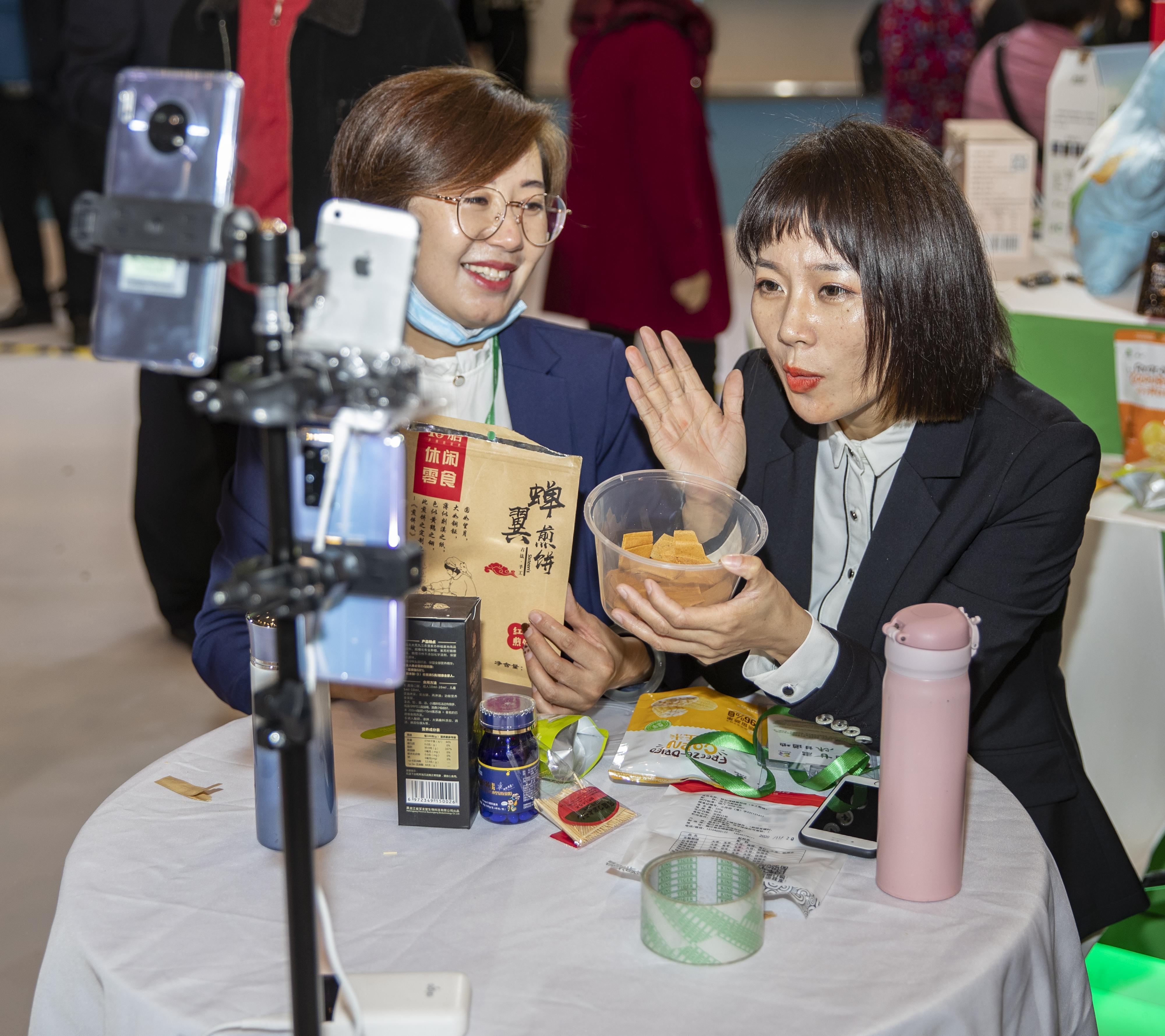 農(nóng)交會北大荒展區(qū)現(xiàn)場,工作人員通過手機(jī)直播的形式為線上瀏覽的觀眾介紹產(chǎn)品。