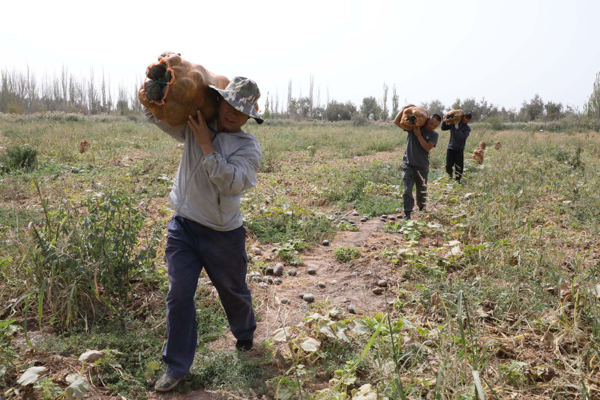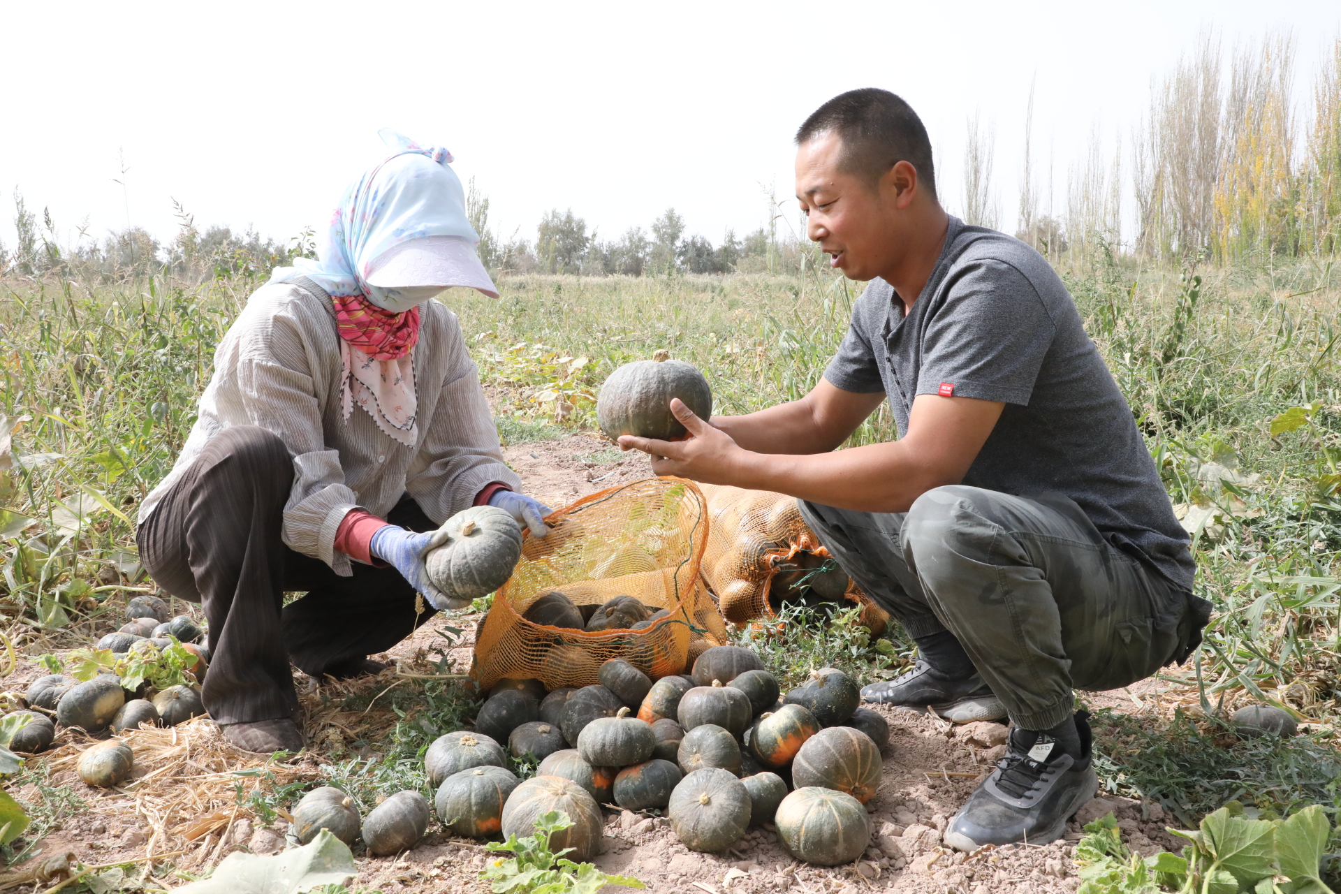 9月20日,走進二團二連職工趙志海種植的貝貝南瓜地,他正忙著和工人們采摘、裝袋、拉運,準備將訂單種植的貝貝南瓜銷售上市。