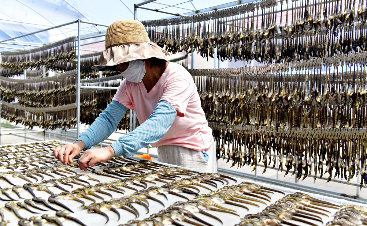 7月4日,在日照市東港區(qū)濤雒鎮(zhèn)膨腹海馬養(yǎng)殖基地,工作人員在晾曬膨腹海馬。