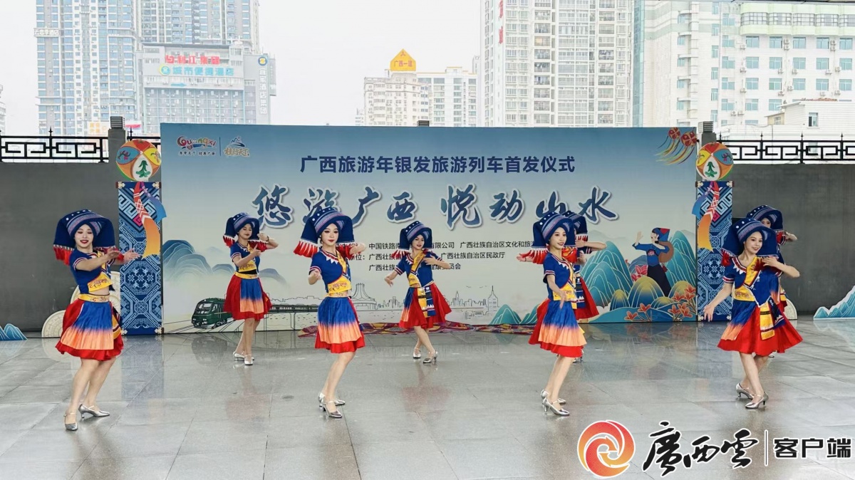 12月3日上午,伴隨悠揚的歌舞聲,廣西旅游年銀發旅游專列活動首趟“桂行天下”旅游專列駛離南寧站,240名游客開啟了3天2晚的南丹“瑤鄉秘境?丹韻悠長”暖冬度假之旅。