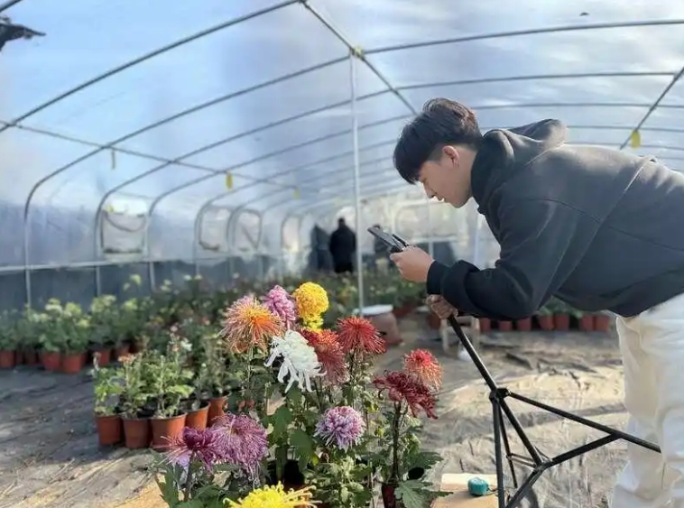 “家人們看這盆‘墨菊’,花瓣層層疊疊,耐寒又好養,喜歡可以直接拍!”11月18日,在河北省淶水縣王村鎮祖各莊村的菊花種植基地內,“00后”青年于淼正對著手機屏幕,熟練地向快手、抖音直播間里的觀眾介紹特色菊花產品。這位擁有20多萬粉絲的“鄉村主播”,是一名選擇回歸鄉土的大學生。他將兒時對菊花的熱愛,轉化為帶動鄉親增收的“美麗事業”。