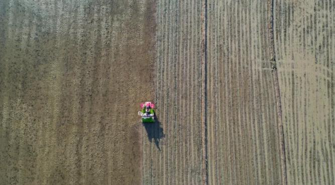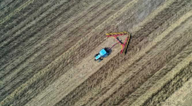 2024年4月2日,農民在吉林省公主嶺市范家屯鎮駕駛農機整理耕地里的秸稈(無人機照片)。新華社記者 張楠 攝
