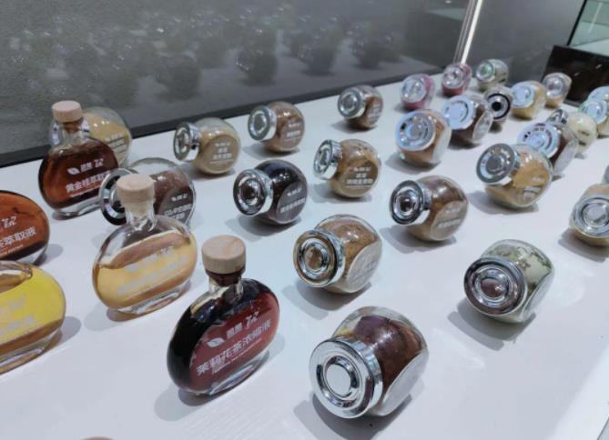 茗皇公司展示中心里茶葉萃取液、茶濃縮液、茶粉等茶產品琳瑯滿目