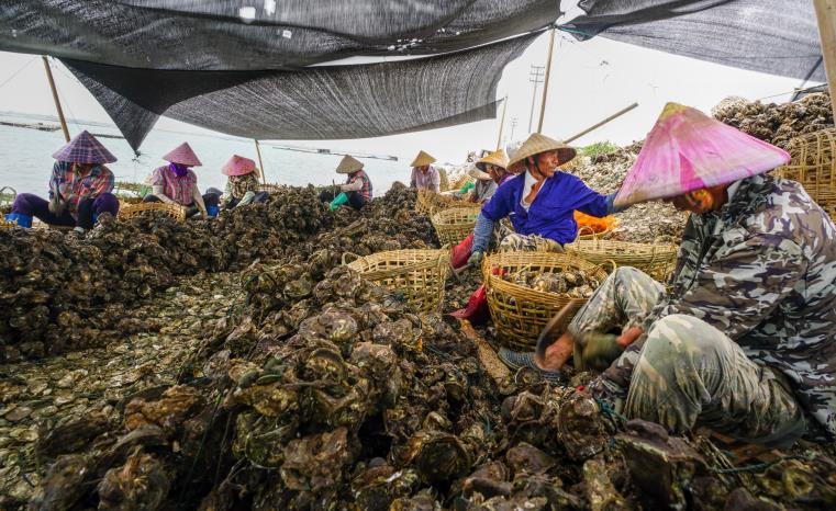 欽州港的蠔農(nóng)正在挑揀大蠔。
