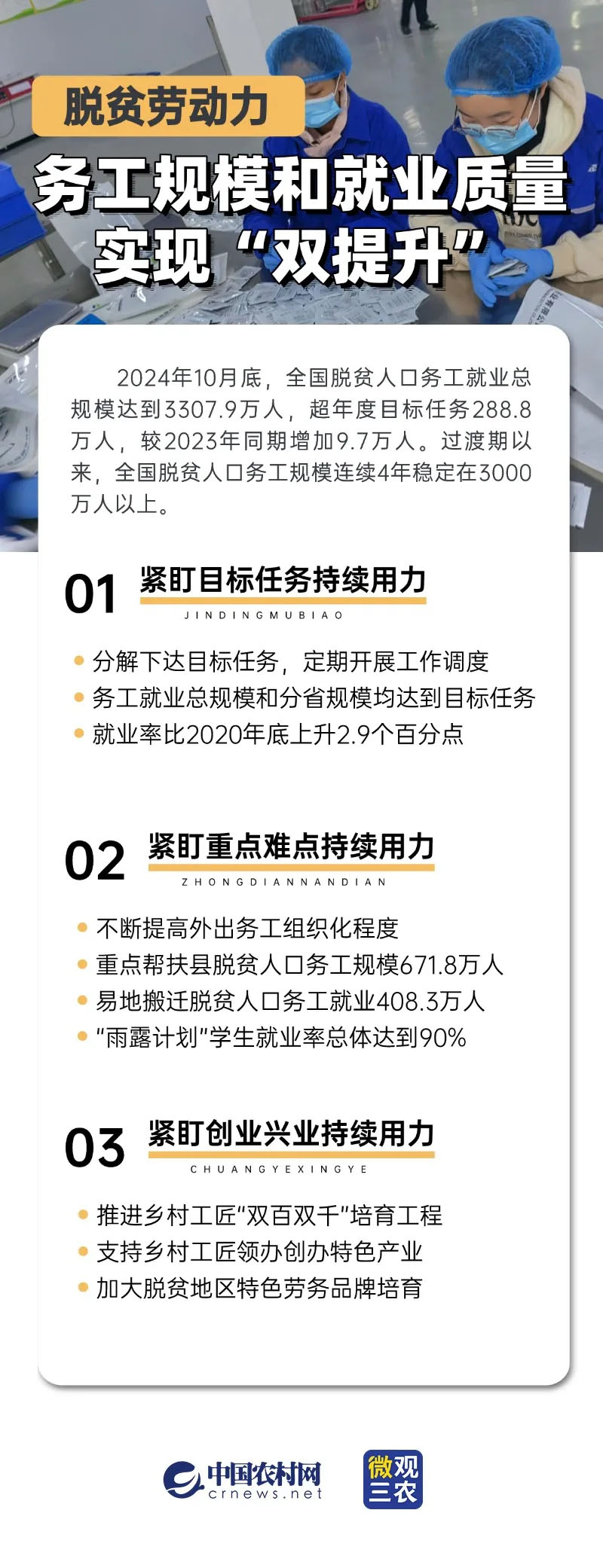 今年以來,農業農村部會同各地各有關部門認真貫徹習近平總書記關于穩定脫貧人口務工規模和務工收入的重要指示精神,千方百計幫助脫貧勞動力穩崗就業,持續推進防止返貧就業攻堅行動,不斷加大幫扶力度、創新幫扶舉措、提高幫扶實效。2024年10月底,全國脫貧人口務工就業總規模達到3307.9萬人,超年度目標任務288.8萬人,較2023年同期增加9.7萬人。
