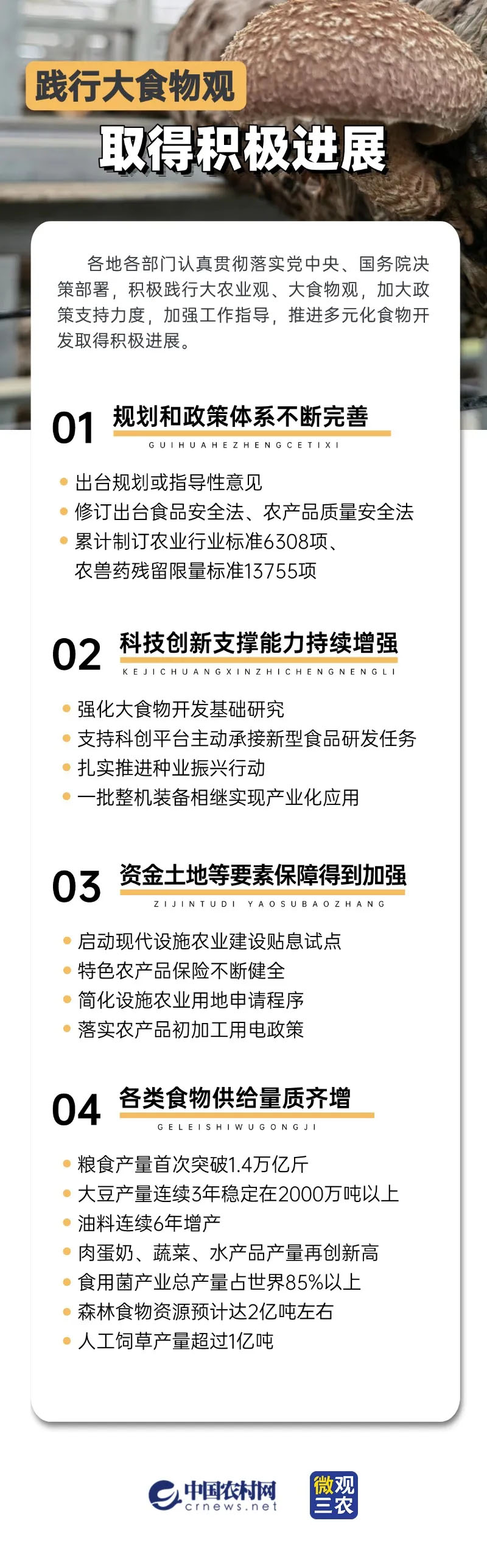 習近平總書記強調,要樹立大農業觀、大食物觀,農林牧漁并舉,構建多元化食物供給體系。黨中央、國務院就踐行大食物觀作出了一系列部署。各地各部門認真貫徹落實黨中央、國務院決策部署,積極踐行大農業觀、大食物觀,加大政策支持力度,加強工作指導,推進多元化食物開發取得積極進展。