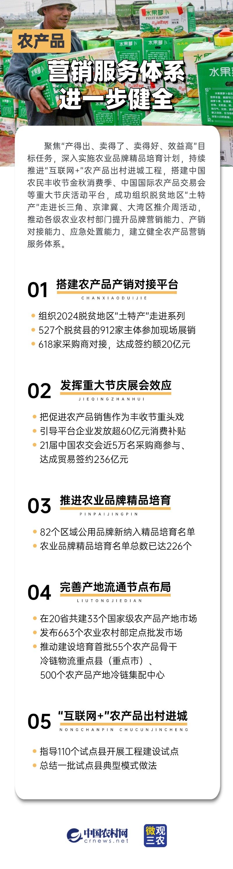 2024年,農業農村部聚焦“產得出、賣得了、賣得好、效益高”的目標任務,深入實施農業品牌精品培育計劃,持續推進“互聯網+”農產品出村進城工程,搭建中國農民豐收節金秋消費季、中國國際農產品交易會等重大節慶活動平臺,成功組織脫貧地區“土特產”走進長三角、京津冀、大灣區推介周活動,推動各級農業農村部門提升品牌營銷能力、產銷對接能力、應急處置能力,建立健全農產品營銷服務體系。
