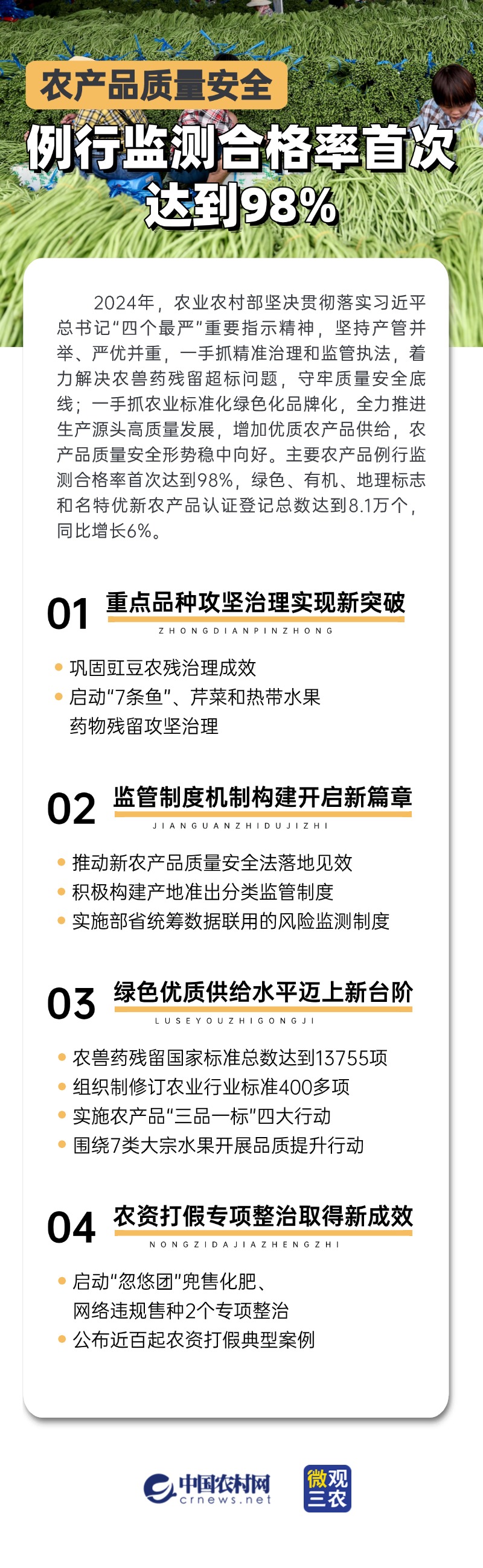 2024年,農業農村部堅決貫徹落實習近平總書記“四個最嚴”重要指示精神,堅持產管并舉、嚴優并重,一手抓精準治理和監管執法,著力解決農獸藥殘留超標問題,守牢質量安全底線;一手抓農業標準化綠色化品牌化,全力推進生產源頭高質量發展,增加優質農產品供給,農產品質量安全形勢穩中向好。主要農產品例行監測合格率首次達到98%,綠色、有機、地理標志和名特優新農產品認證登記總數達到8.1萬個,同比增長6%。
