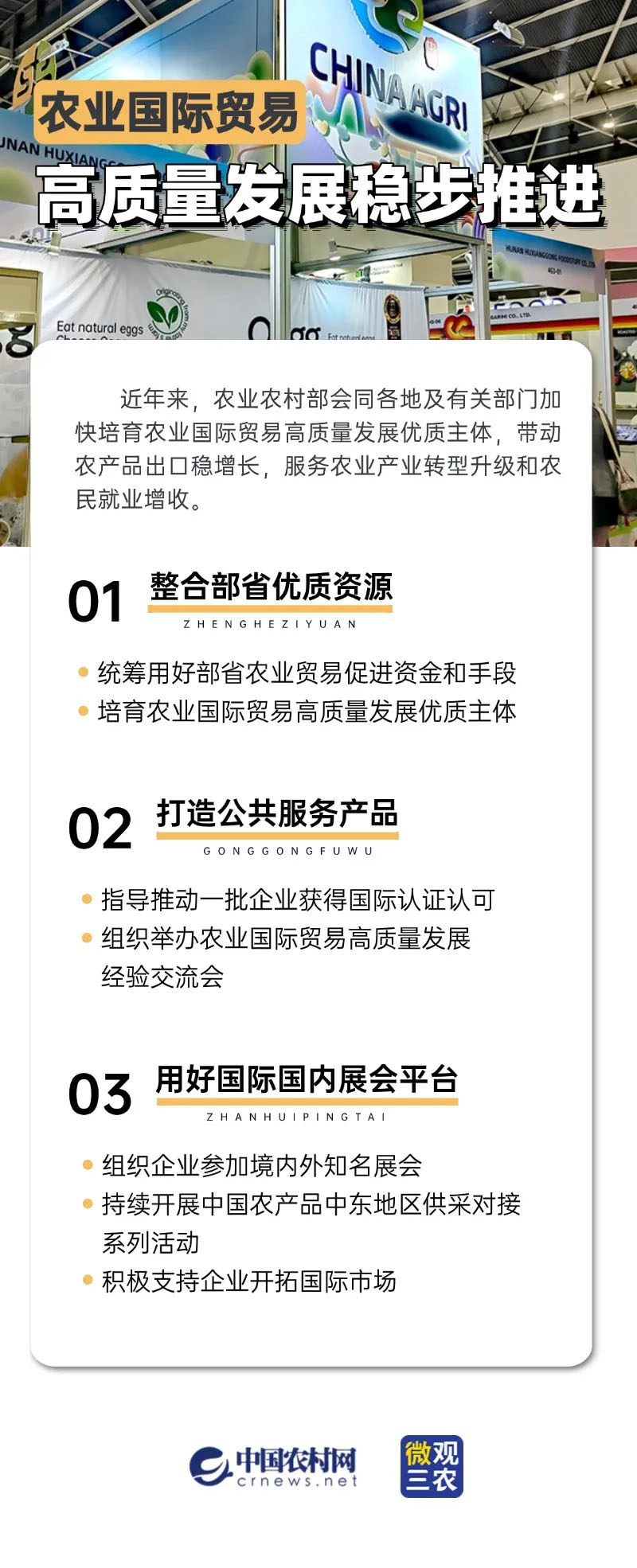 近年來,農業農村部會同各地及有關部門加快培育農業國際貿易高質量發展優質主體,帶動農產品出口穩增長,服務農業產業轉型升級和農民就業增收。