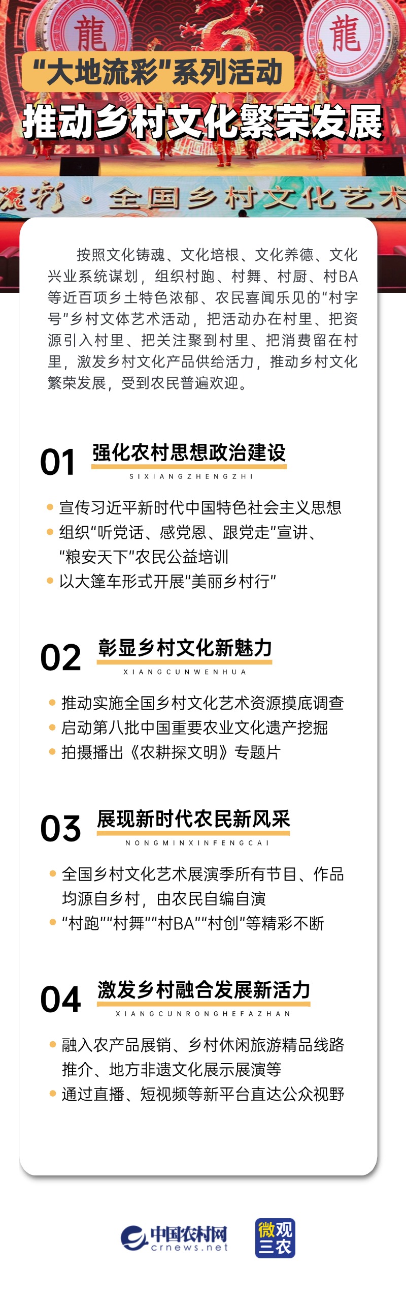 2024年以來,農業農村部會同中國文聯印發《“大地流彩——全國鄉村文化振興在行動”工作方案》,按照文化鑄魂、文化培根、文化養德、文化興業進行系統謀劃,組織了村跑、村舞、村廚、村BA等近百項鄉土特色濃郁、農民喜聞樂見的“村字號”鄉村文體藝術活動,堅持把活動辦在村里、把資源引入村里、把關注聚焦到村里、把消費留在村里,激發了鄉村文化產品供給活力,推動鄉村文化繁榮發展,受到農民群眾普遍歡迎。