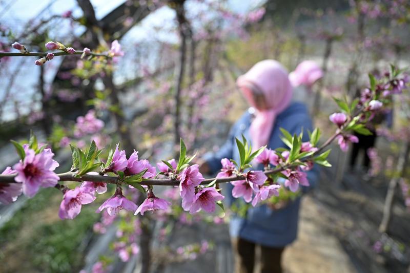 近日,寧夏銀川市賀蘭縣金貴鎮日光溫室內桃花盛開、春意盎然,農戶忙著為桃樹剪枝。據了解,金貴鎮近年來依托日光溫室果蔬種植,結合鄉村旅游、休閑采摘等體驗項目,吸引眾多游客前來賞花、觀光、采摘。“產業+鄉村游”已成為當地百姓致富的新模式。 新華社記者 王鵬 攝