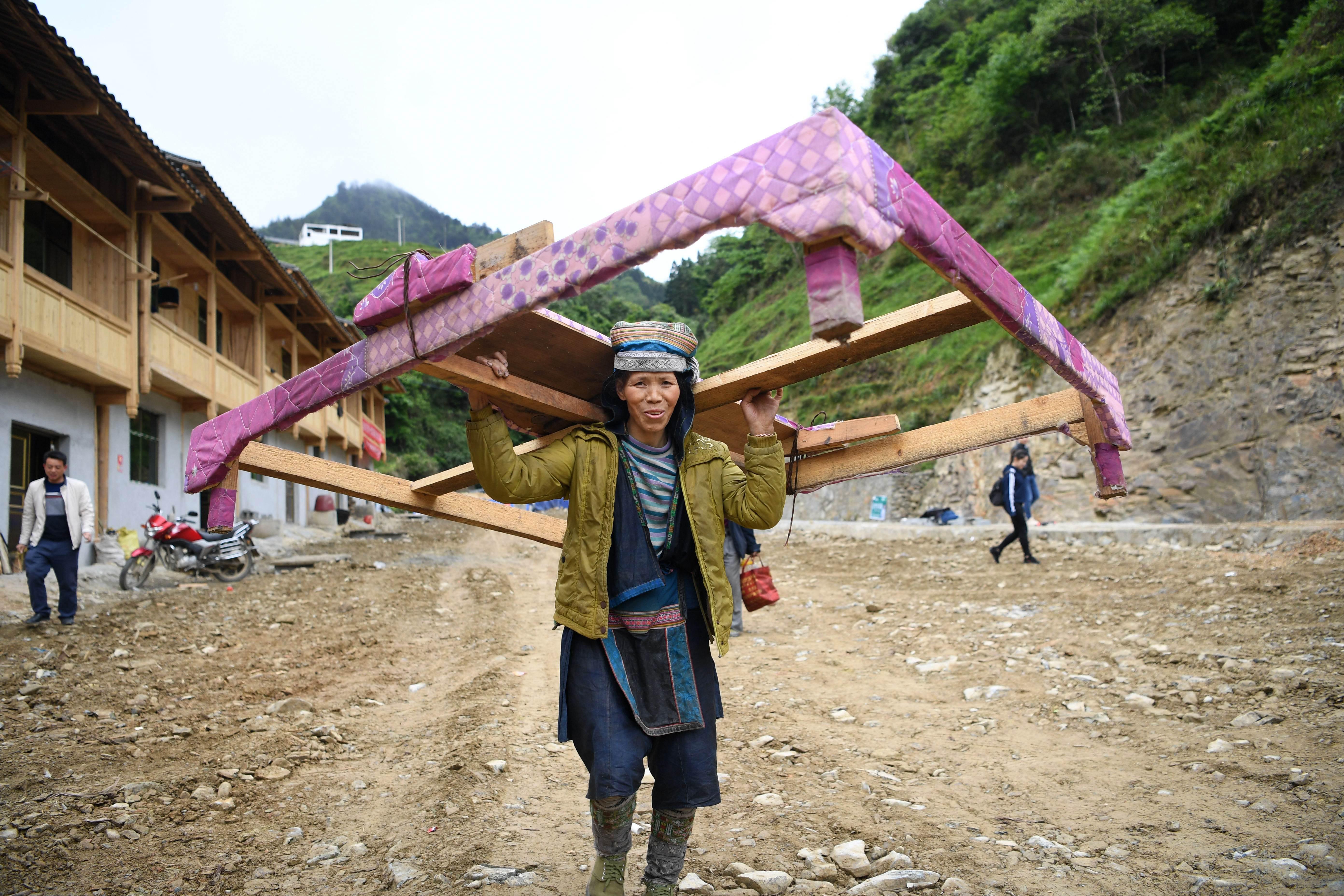 4月21日,在貴州省榕江縣定威水族鄉控乃村地質災害搬遷安置點,一位苗族婦女在搬運物品。