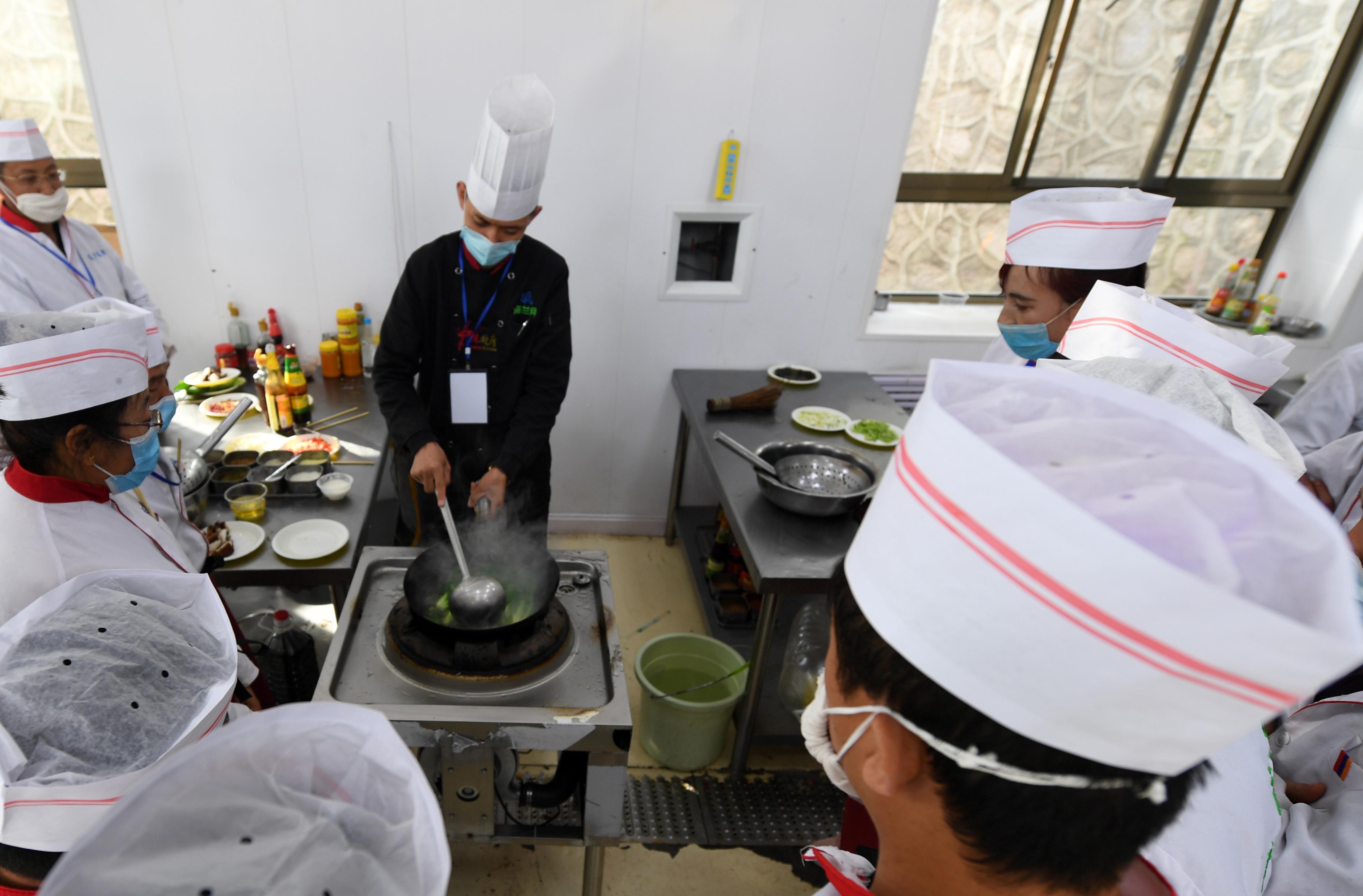 4月21日,在東鄉縣職業技術學校,中式烹飪培訓班學員上實操課。
