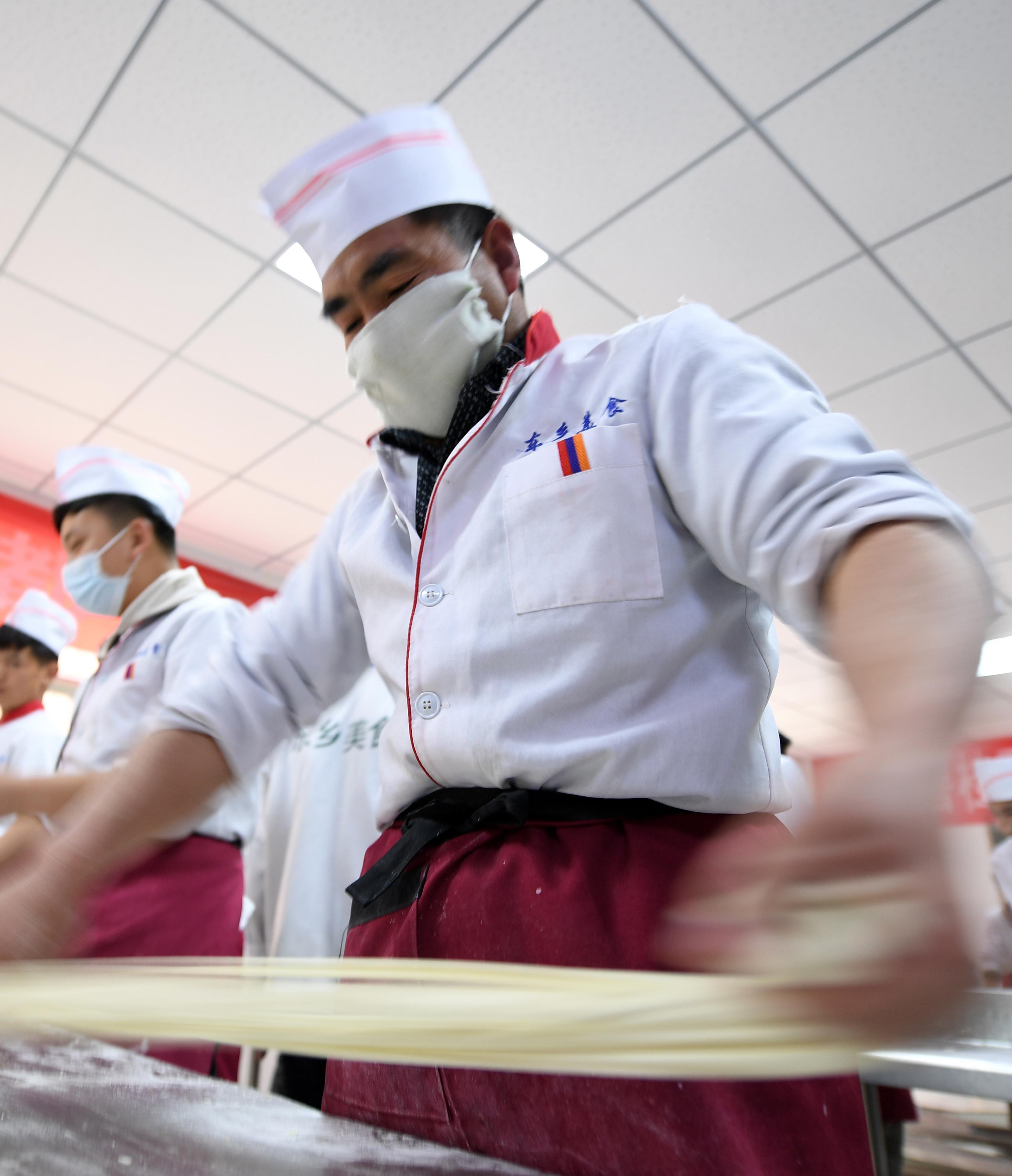 4月21日,在東鄉縣職業技術學校,牛肉拉面培訓班學員練習拉面。