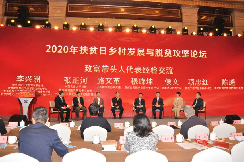 10月14日, 2020年國家扶貧日系列論壇“鄉村發展與脫貧攻堅論壇”在京召開。此次論壇以“黨建引領,固本強基,全面加強致富帶頭人培育工作”為主題,是“2020年國家扶貧日系列論壇”的分論壇之一。本次論壇由國務院扶貧辦社會扶貧司、開發指導司指導,中國扶貧志愿服務促進會主辦,中國平安保險(集團)股份有限公司、平安銀行股份有限公司承辦。來自省市縣鄉村各級致力于致富帶頭人培育工作的代表,戰斗在脫貧攻堅一線的致富帶頭人代表,支持、熱心于致富帶頭人培育工作的各級領導、專家學者、公益組織、企業界和媒體代表等共計300余人出席了論壇。中國扶貧志愿服務促進會常務副會長劉智勇、國務院扶貧辦開發指導司副司長劉曉山分階段主持論壇。