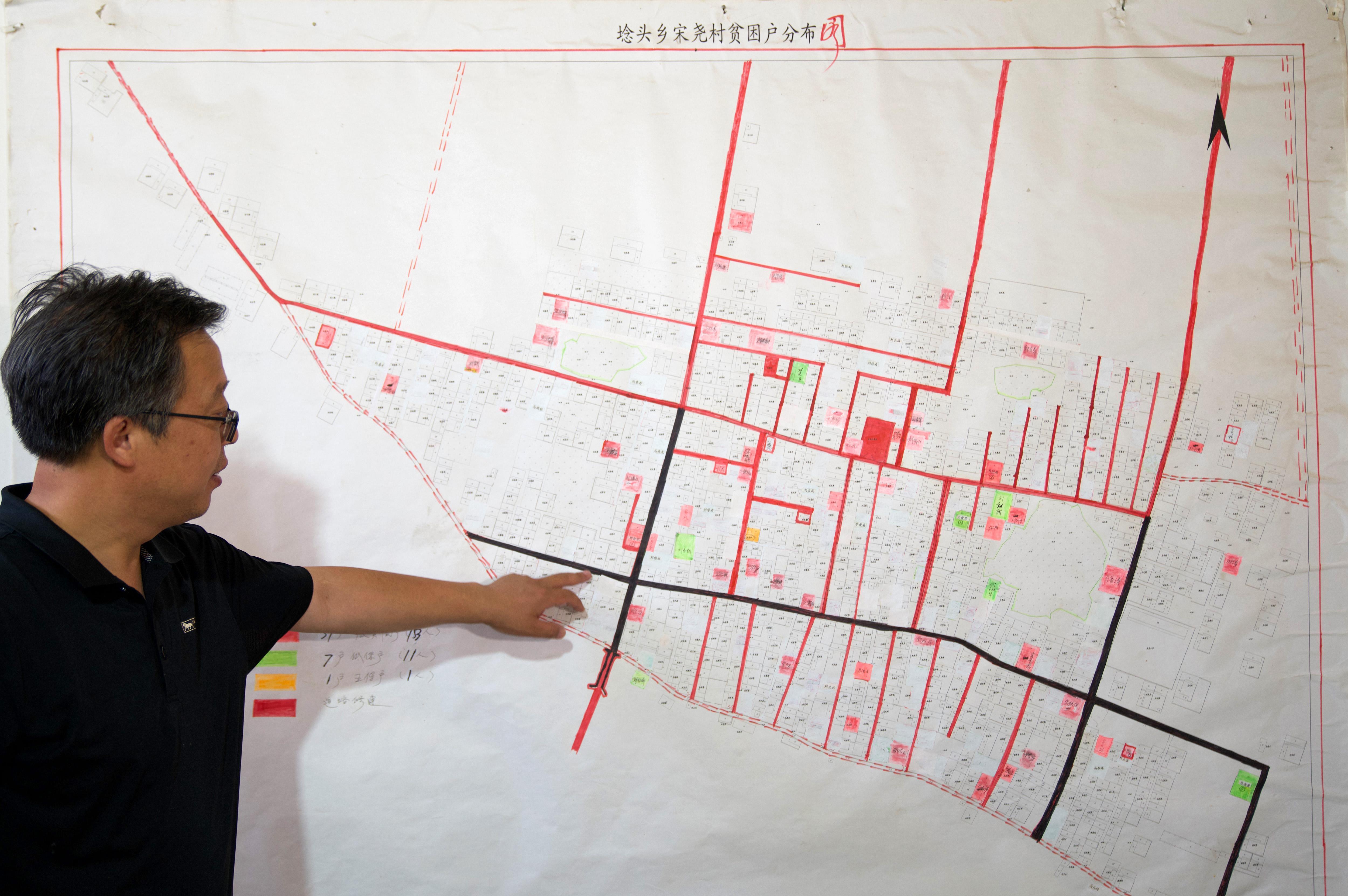 錦旗旁,那張彩色“貧困戶分布圖”仍在。我注意到,圖上街道、胡同也是用不同色彩的筆標畫的,這是為什么?
