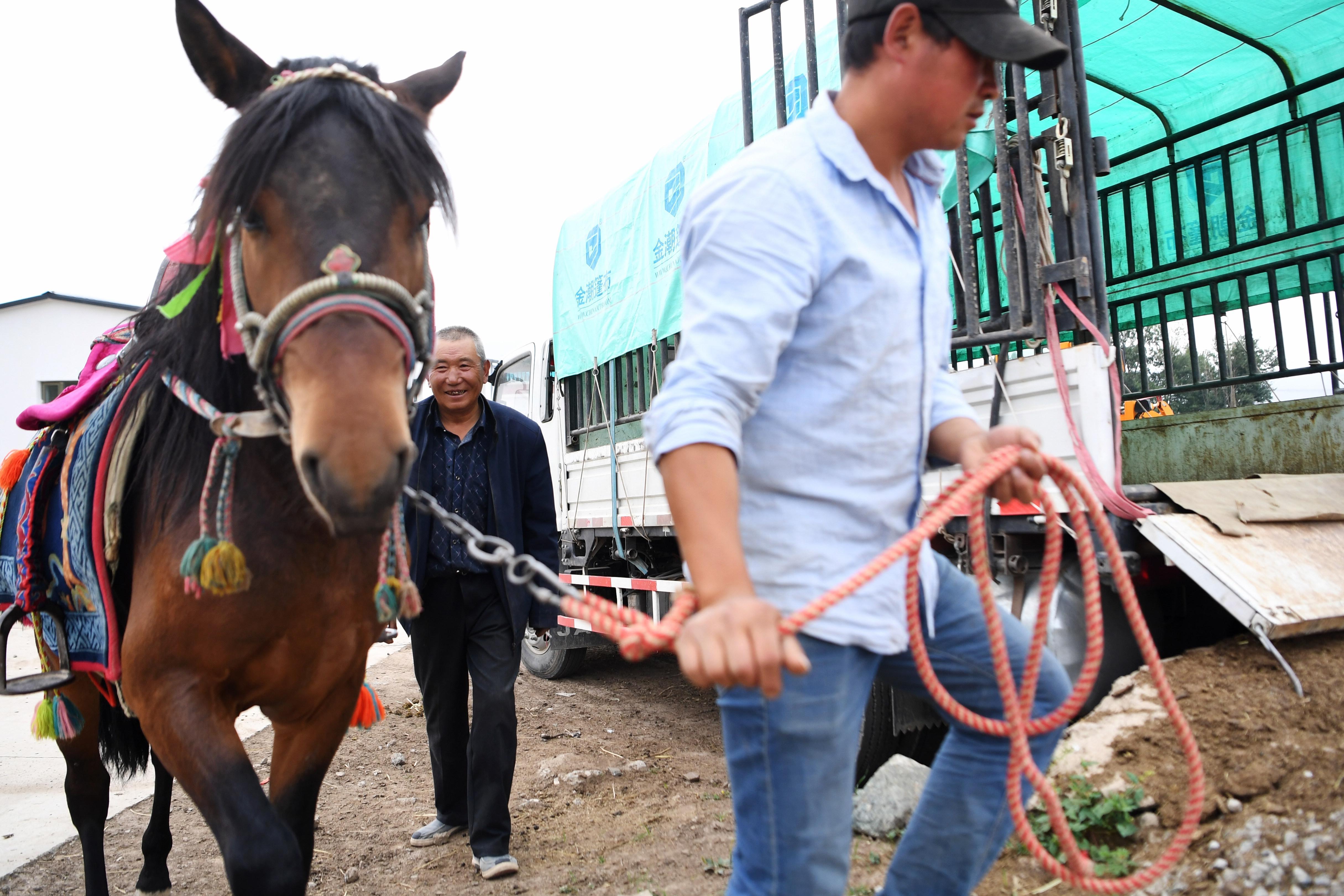 8月3日,李懷智(后)目送兒子將一匹馬牽上貨車準備去訓練。