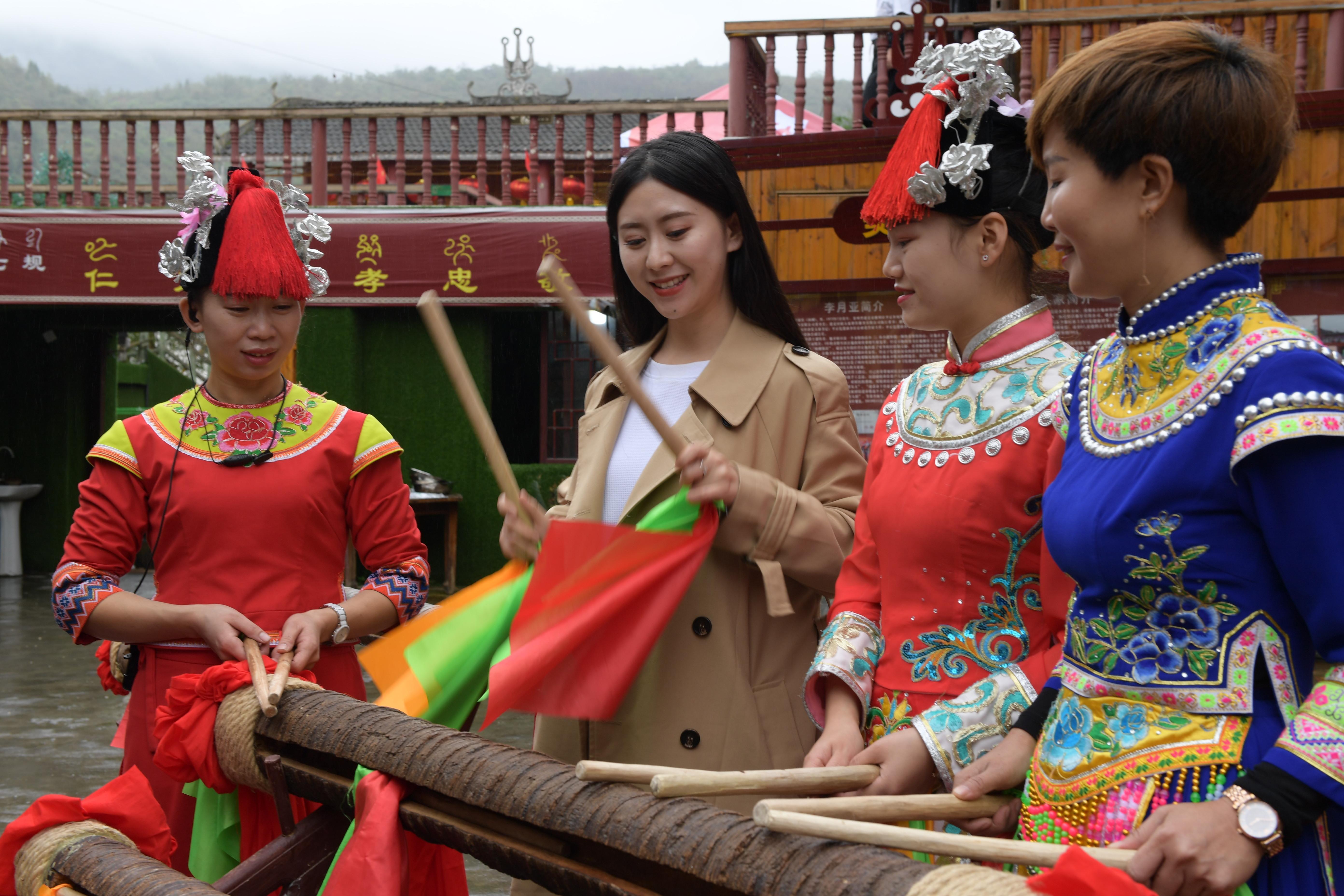 10月14日,在貴州省遵義市播州區平正仡佬族鄉鄉村大舞臺“山姑人家”,播州區文化館的老師(左二)在教村民打蹦蹦鼓。