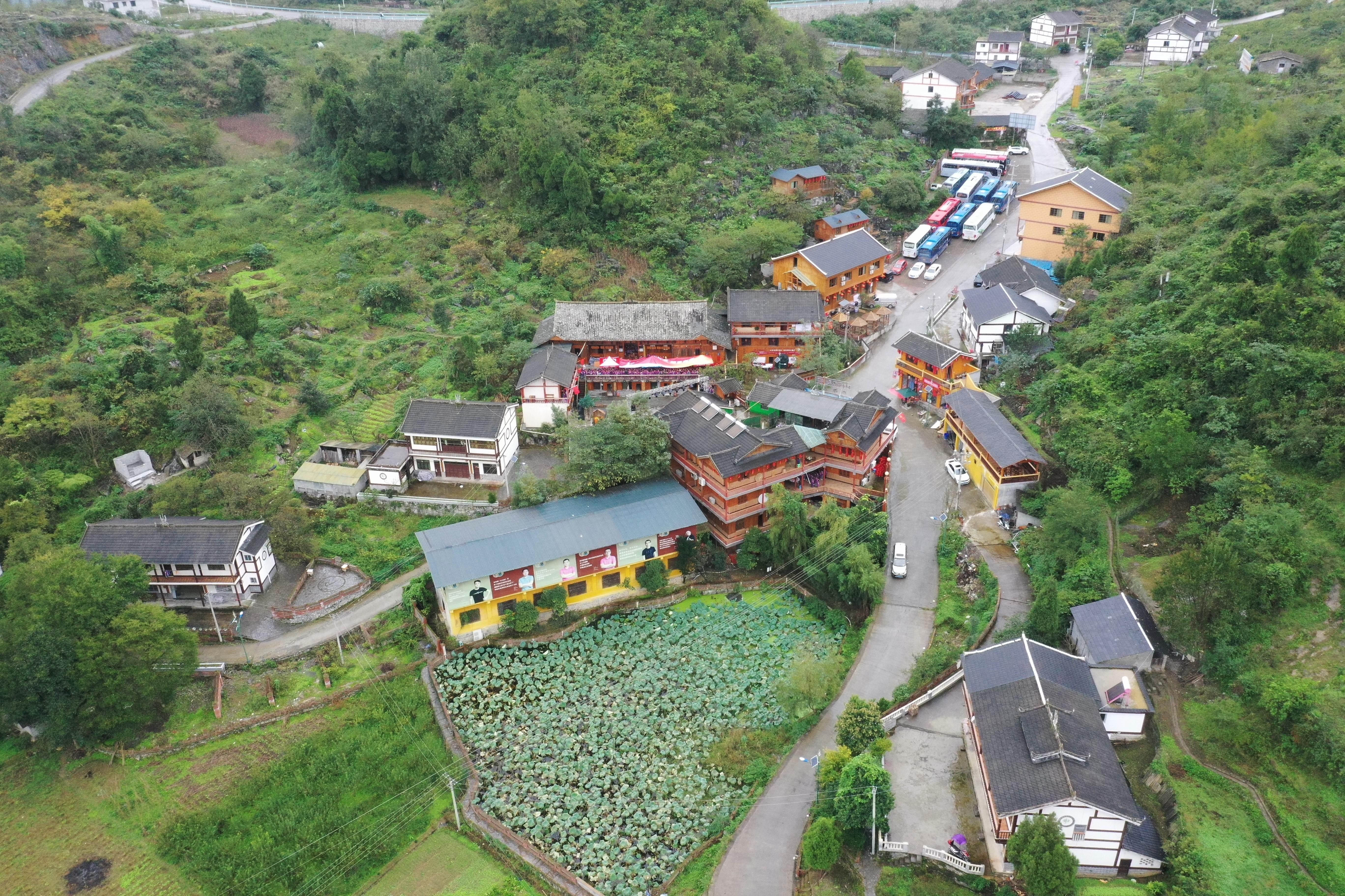10月14日拍攝的貴州省遵義市播州區平正仡佬族鄉鄉村大舞臺“山姑人家”(無人機照片)。