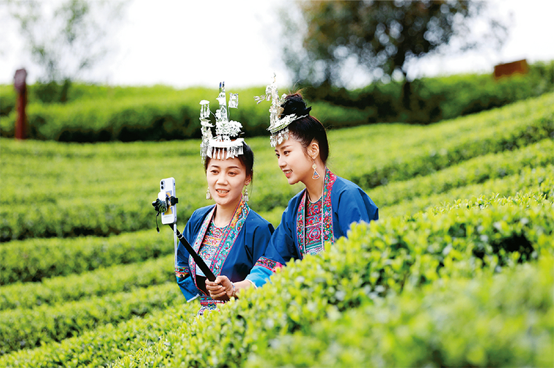 疫情防控期間,針對貧困地區出現的農畜牧產品滯銷問題,一些地方積極組織產銷對接,開展消費扶貧行動,利用互聯網拓寬銷售渠道,多渠道解決農產品賣難問題。圖為2020年3月14日,在廣西壯族自治區柳州市三江侗族自治縣八江鎮布央村,侗族姑娘通過直播平臺向網民推介三江茶。 人民圖片 吳練勛/攝